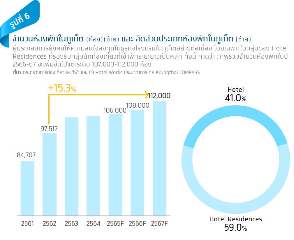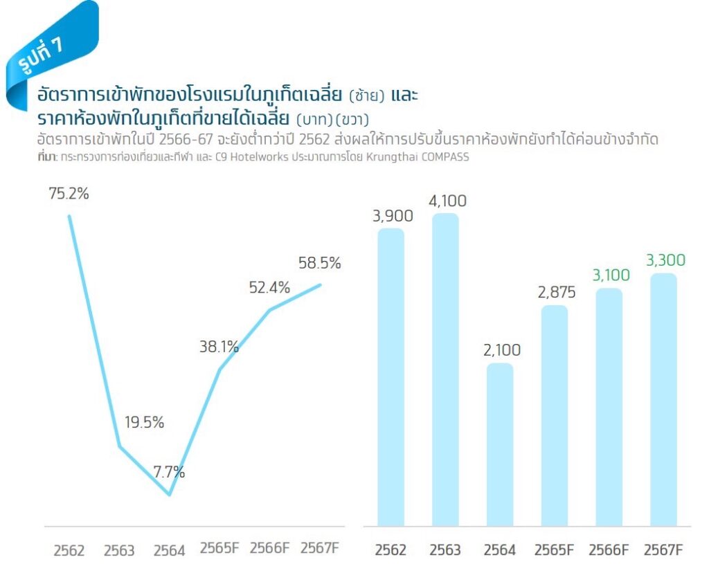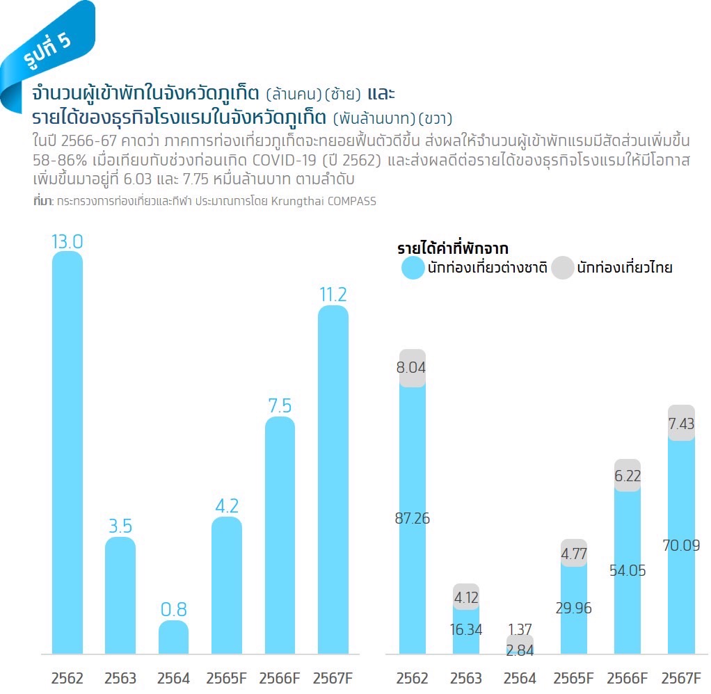 Krungthai COMPASS ประเมินว่าธุรกิจโรงแรมในภูเก็ตในปี 2566-67 จะฟื้นตัวดีขึ้น โดยมีจำนวนผู้เข้าพักแรมเพิ่มขึ้นจาก 4.2 ล้านคนในปี 2565 มาอยู่ที่ 7.5 และ 11.2 ล้านคน และรายได้ของธุรกิจโรงแรมจะทยอยฟื้นตัว จาก 3.47 หมื่นล้านบาทในปี 2565 มาอยู่ที่ 6.03 และ 7.75 หมื่นล้านบาท แต่ยังถือว่าต่ำกว่าปี 2562 ที่มีรายได้อยู่ที่ 9.53 หมื่นล้านบาท อยู่ในระดับหนึ่ง