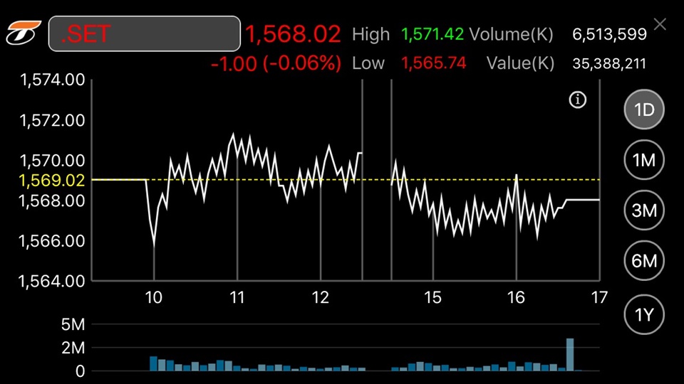 ผู้สื่อข่าวรายงานว่าวันนี้ (8 พ.ค.) ดัชนีตลาดหลักทรัพย์ฯ ปิดการซื้อขายที่ระดับ 1,568.02 จุด ลดลง 1.00 จุด หรือร้อยละ 0.06 มูลค่าการซื้อขาย 35,388.21 ล้านบาท ดัชนีเคลื่อนไหวทั้งแดนบวก-ลบ โดยเคลื่อนไหวในช่วงแคบ ๆ ดัชนีแตะจุดสูงสุดที่ 1,571.42 จุด และแตะจุดต่ำสุดที่ระดับ 1,565.74 จุด
