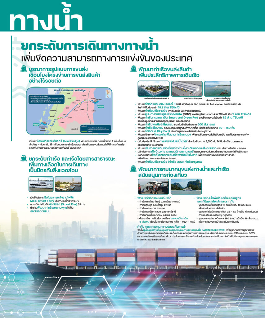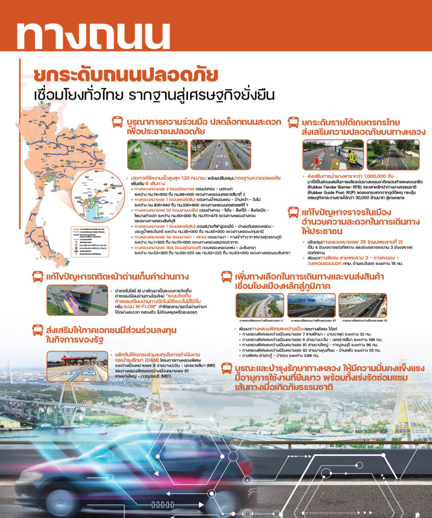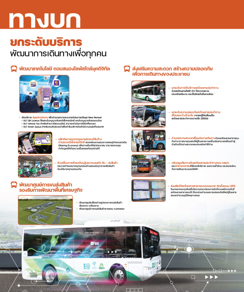 โดยจาก 79 นโยบายในปี 2565 ที่มีทั้งหมด 167 โครงการ เป็นโครงการที่ดำเนินการแล้วเสร็จหรือเปิดให้บริการแล้ว รวม 61 โครงการ อยู่ระหว่างดำเนินการ จำนวน 64 โครงการ อยู่ในช่วงจัดทำแผนงานหรือออกแบบ จำนวน 42 โครงการ ส่วนโครงการหรือกิจกรรมที่จะต้องดำเนินการต่อเนื่องให้แล้วเสร็จ รวมถึงโครงการใหม่ที่จะทำในปี 2566 จำนวน 171 โครงการ เป็นโครงการใหม่ปี 2566 จำนวน 58 โครงการ สำหรับแหล่งเงินในการพัฒนา 171 โครงการ วงเงินลงทุนทั้งในและนอกงบประมาณภาคคมนาคมทั้งโครงการตั้งแต่ปี 2558-2570 จำนวน 2,718,959 ล้านบาท