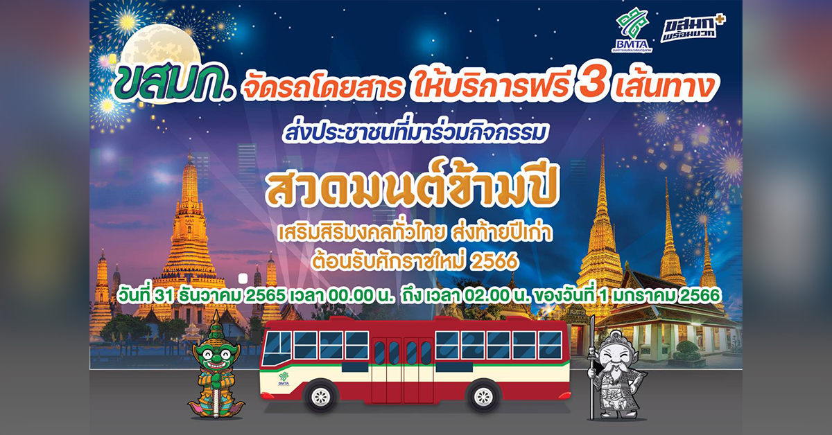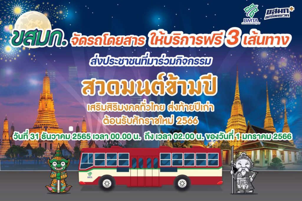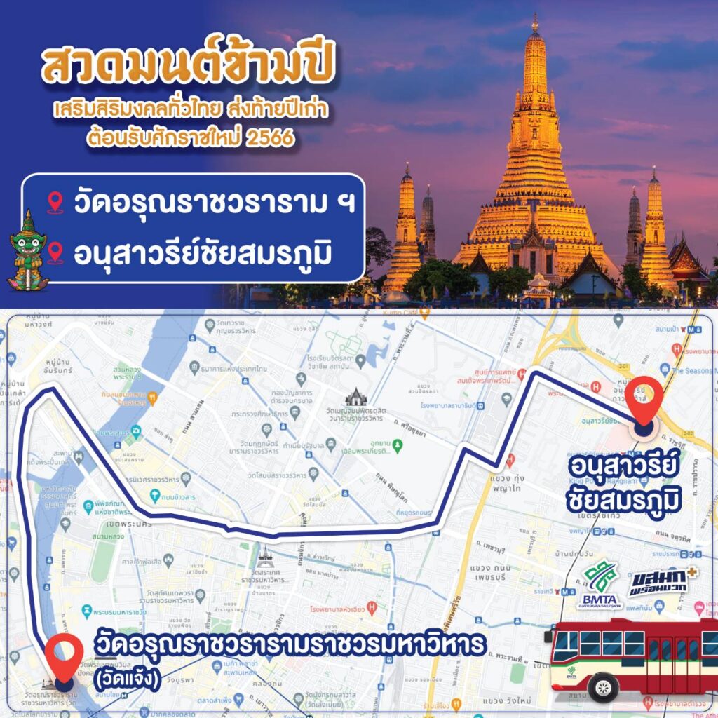 – สถานีกลางกรุงเทพอภิวัฒน์ (บางซื่อ) จำนวน 3 เส้นทาง ได้แก่ สาย 3, 49 และ 67 - จัดเดินรถโดยสารธรรมดา (เฉพาะกิจ) ให้บริการฟรี จำนวน 3 เส้นทาง เพื่อส่งประชาชนที่มาร่วมกิจกรรม“สวดมนต์ข้ามปี เสริมสิริมงคลทั่วไทย ส่งท้ายปีเก่า ต้อนรับศักราชใหม่ 2566” ณ วัดพระเชตุพน-วิมลมังคลาราม และวัดอรุณราชวราราม ในวันที่ 31 ธันวาคม 2565 ตั้งแต่เวลา 00.00 น. ถึงเวลา 02.00 น. ของวันที่ 1 มกราคม 2566 โดยมีรายละเอียด ดังนี้