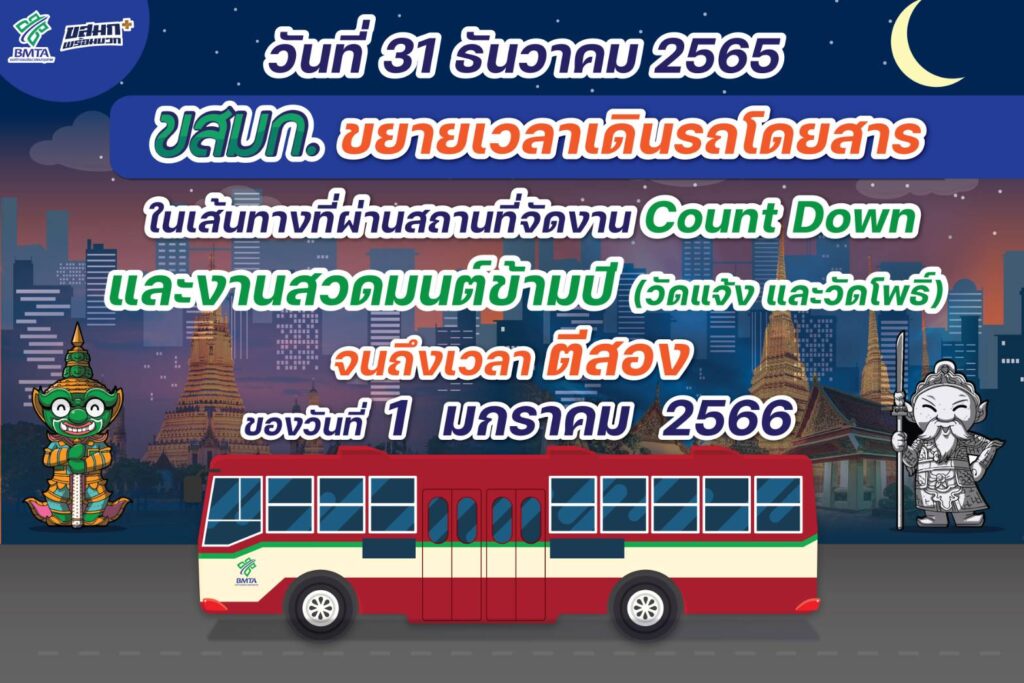 นายกิตติกานต์ จอมดวง จารุวรพลกุล ผู้อำนวยการองค์การขนส่งมวลชนกรุงเทพ เปิดเผยว่า ตามที่รัฐบาลประกาศให้ วันศุกร์ที่ 30 ธันวาคม 2565 เป็นวันหยุดราชการกรณีพิเศษ ส่งผลให้มีวันหยุดต่อเนื่องในช่วงเทศกาลปีใหม่ 2566 จำนวน 5 วัน ตั้งแต่วันที่ 30 ธันวาคม 2565 ถึงวันที่ 3 มกราคม 2566 ซึ่งประชาชนนิยมเดินทางกลับภูมิลำเนา หรือท่องเที่ยวต่างจังหวัดเป็นจำนวนมาก ขสมก. จึงได้จัดแผนการเดินรถโดยสารรองรับการเดินทางของประชาชน เพื่ออำนวยความสะดวก ปลอดภัย สร้างความมั่นใจในการเดินทางแก่ประชาชนผู้ใช้บริการ ตั้งแต่วันที่ 29 ธันวาคม 2565 – 4 มกราคม 2566 ตามนโยบายของรัฐมนตรีว่าการกระทรวงคมนาคม ที่มีความปรารถนาให้ประชาชนทุกคน เดินทางด้วยความสะดวกและปลอดภัยในทุกเส้นทาง ตลอดช่วงเทศกาลปีใหม่ 2566 ซึ่งแผนการจัดเดินรถโดยสาร มีรายละเอียด ดังนี้