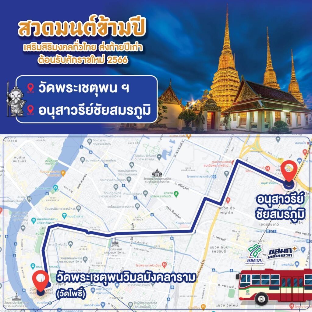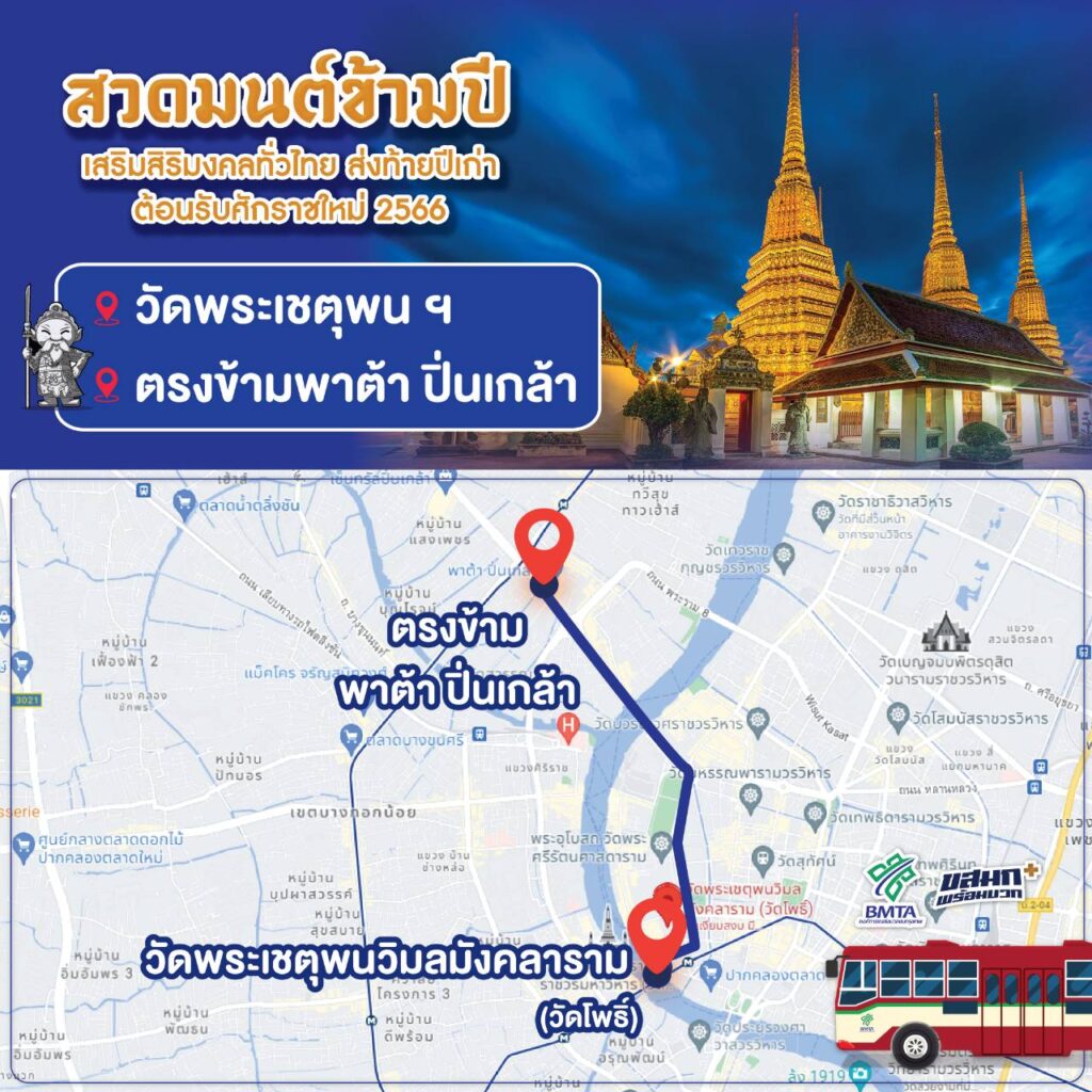 4.3 วัดพระเชตุพนวิมลมังคลาราม – ฝั่งตรงข้ามห้างสรรพสินค้าพาต้าปิ่นเกล้า จำนวน 2 คัน - จัดเดินรถโดยสารช่วงส่งท้ายปีเก่าต้อนรับปีใหม่ 2566 ในเขตกรุงเทพมหานคร ช่วงคืนวันที่ 31 ธันวาคม 2565 โดยขยายเวลาเดินรถในเส้นทางที่ผ่านสถานที่จัดงาน Count Down ที่สำคัญ ๆ อาทิ สยามพารากอน ไอคอนสยาม เอเชียทีค เดอะริเวอร์ฟร้อนท์ สามย่านมิตรทาวน์ และวัดที่จัดกิจกรรม “สวดมนต์ข้ามปี เสริมสิริมงคลทั่วไทย ส่งท้ายปีเก่า ต้อนรับศักราชใหม่ 2566” จำนวน 2 วัด ได้แก่ วัดพระเชตุพนวิมลมังคลาราม และวัดอรุณราชวราราม ถึงเวลา 02.00 น. ของวันที่ 1 มกราคม 2566 .-สำนักข่าวไทย