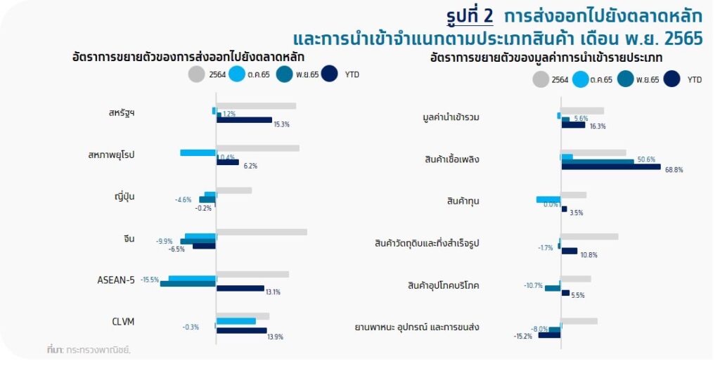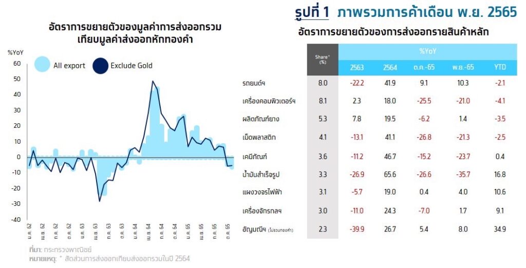 Krungthai COMPASS นำเสนอบทวิเคราะห์เรื่อง “ส่งออกเดือน พ.ย. หดตัว 6.0% หดตัวต่อเนื่องเป็นเดือนที่ 2 จากเศรษฐกิจโลกที่ชะลอตัว ” โดยส่งออกเดือน พ.ย. ติดลบ 6.0%YoY หดตัวต่อเนื่องเป็นเดือนที่ 2 มากกว่าการคาดการณ์ของตลาดที่ -5.2% จากการส่งออกสินค้าอุตสาหกรรมและสินค้าเกษตรที่หดตัวต่อเนื่อง ตามการชะลอตัวของเศรษฐกิจโลกและ