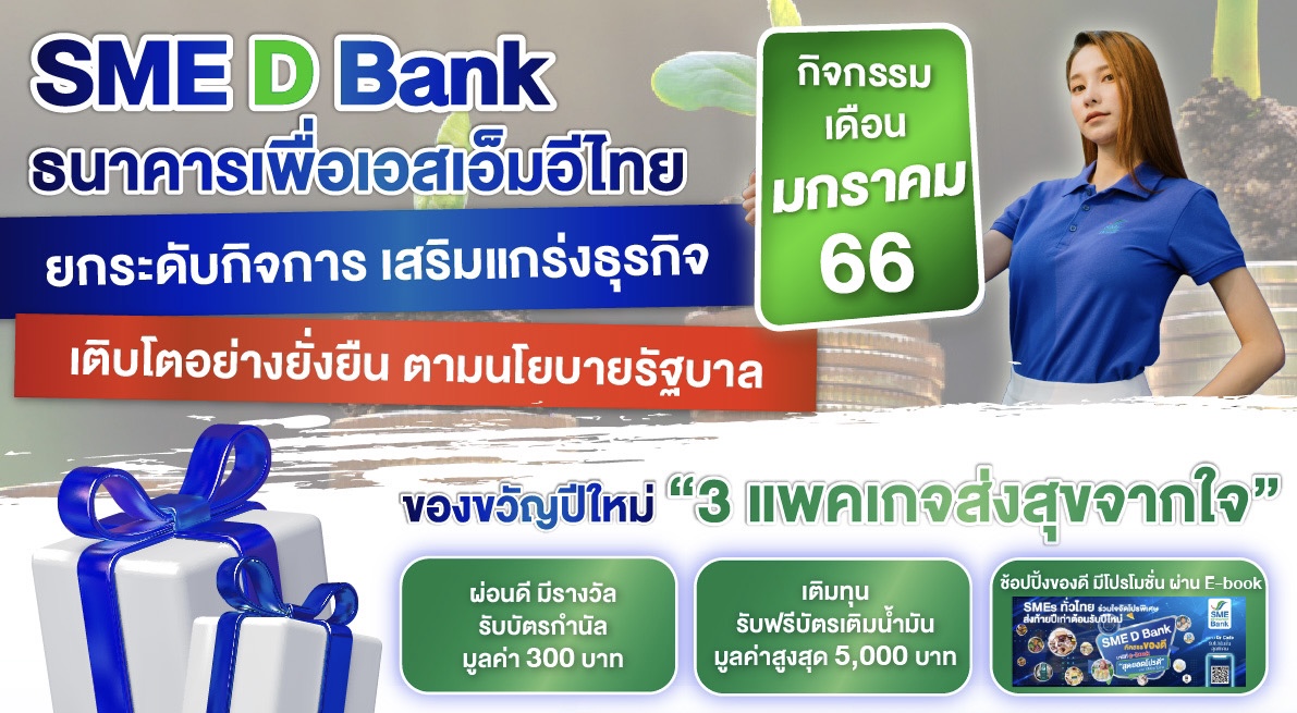 ธนาคารพัฒนาวิสาหกิจขนาดกลางและขนาดย่อมแห่งประเทศไทย (ธพว.) หรือ SME D Bank เดินหน้าภารกิจธนาคารเพื่อพัฒนาเอสเอ็มอีไทย จัดโปรแกรมพัฒนา รับเปิดศักราชใหม่ ตลอดเดือนมกราคม 2566 สนับสนุนผู้ประกอบการเอสเอ็มอีไทย เข้าถึงแหล่งทุน เสริมสภาพคล่อง ยกระดับธุรกิจ ขยายตลาด เพิ่มยอดขาย ขับเคลื่อนกิจการสู่การเติบโตอย่างยั่งยืน ประกอบด้วย