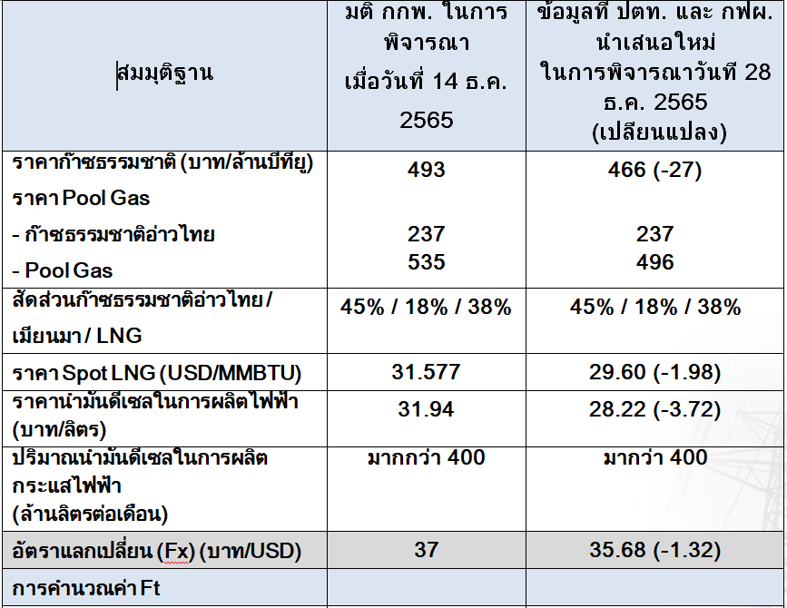 นายคมกฤช ตันตระวาณิชย์ เลขาธิการสำนักงานคณะกรรมการกำกับกิจการพลังงาน (กกพ.) ในฐานะโฆษก กกพ. เปิดเผยว่า กกพ. ในการประชุมครั้งที่ 60/2565 (ครั้งที่ 827) เมื่อวันที่ 28 ธันวาคม 2566 พิจารณาผลการคำนวณค่าเอฟทีเพิ่มเติมอีกครั้งหลังจากที่ กฟผ. และ ปตท. ทบทวนประมาณการราคาก๊าซธรรมชาติ ราคาน้ำมันดีเซล อัตราแลกเปลี่ยน และภาระหนี้คงค้างของ กฟผ. สำหรับการคำนวณอัตราค่าเอฟที (Ft) ตามที่ กกพ. ได้พิจารณาไปแล้วในการประชุมครั้งที่ 58/2565 (ครั้งที่ 825) เมื่อวันที่ 14 ธันวาคม 2565 โดยมีสมมุติฐานที่เปลี่ยนแปลง ดังนี้