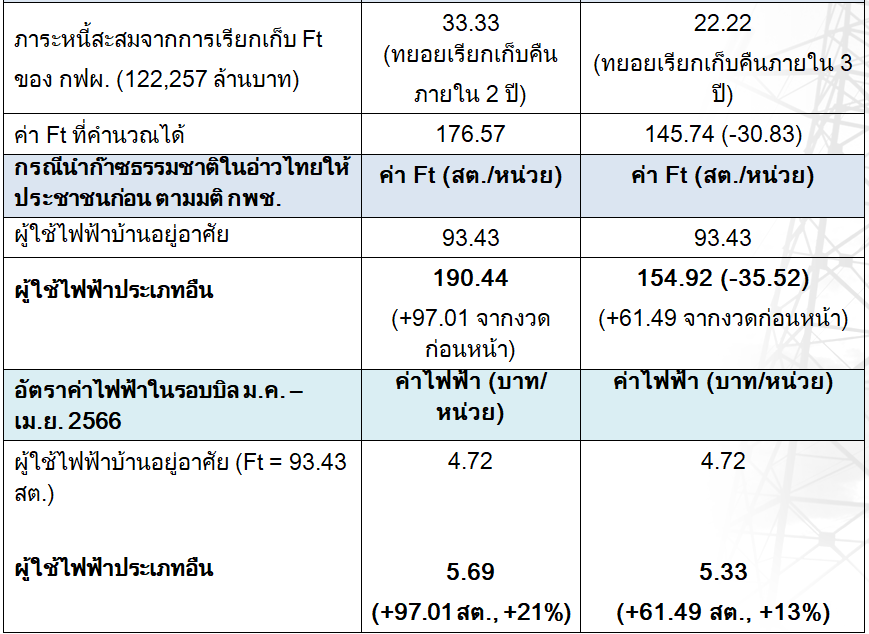 หมายเหตุ: * กฟผ. คำนวณกรณีศึกษาเพิ่มเติม โดยจัดสรรก๊าซอ่าวไทยเพื่อการผลิตไฟฟ้าสำหรับผู้ใช้ไฟฟ้าบ้านอยู่อาศัย ราคา 237 บาทต่อล้านบีทียู ในปริมาณที่ไม่เพิ่มภาระอัตราค่าไฟฟ้าจากปัจจุบัน (รวมการทยอยคืนค่า AF ให้กับ กฟผ. 22.22 สตางค์ต่อหน่วย) ตามมติ กพช. ในสัดส่วนประมาณร้อยละ 28.16 จากการผลิตไฟฟ้าทั้งหมด หรือประมาณ 64,980 ล้านบีทียู ในช่วงเดือนมกราคม-เมษายน 2566 ส่งผลให้ราคาก๊าซธรรมชาติสำหรับผู้ใช้ก๊าซรายอื่นเพิ่มขึ้นเป็น 496 บาทต่อล้านบีทียู