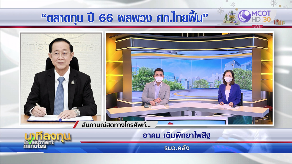 นายอาคม เติมพิทยาไพสิฐ รัฐมนตรีว่าการกระทรวงการคลัง ให้สัมภาษณ์ในรายการ “นาทีลงทุน” ทางช่อง 9 MCOT HD หมายเลข 30 ถึงภาพรวมแนวโน้มเศรษฐกิจไทยในปี2566 โดยระบุว่า ภาพรวมเศรษฐกิจไทยชัดเจนว่าจะขยายตัวต่อเนื่องจากปีนี้ ที่คาดว่าอัตราการขยายตัวของเศรฐกิจครบปีจะเติบโตได้ที่ประมาณ 3.0-3.2 %โดยมีแรงส่งสำคัญคือภาคการท่องเที่ยว และภาคบริการโดยเฉพาะธุรกิจโรงแรม รีสอร์ต ซึ่งส่วนสำคัญที่ไม่ค่อยได้พูดถึงคือการท่องเที่ยวในประเทศ หลังการเปิดประเทศผ่อนคลายมาตรการควบคุมโควิด คนไทยท่องเที่ยวมากขึ้น ส่วนแรงส่งด้านการท่องเที่ยวจะมากแค่ไหนนั้น ปีนี้เรารับนักท่องเที่ยวแล้ว 10 ล้านคน ส่วนปีหน้าคาดว่าจะมีนักท่องเที่ยว 20-21 ล้านคน หรืออาจจะมากกว่านั้น เพราะหากประเทศจีนเปิดประเทศ ผู้คนจะหลังไหลเข้ามา