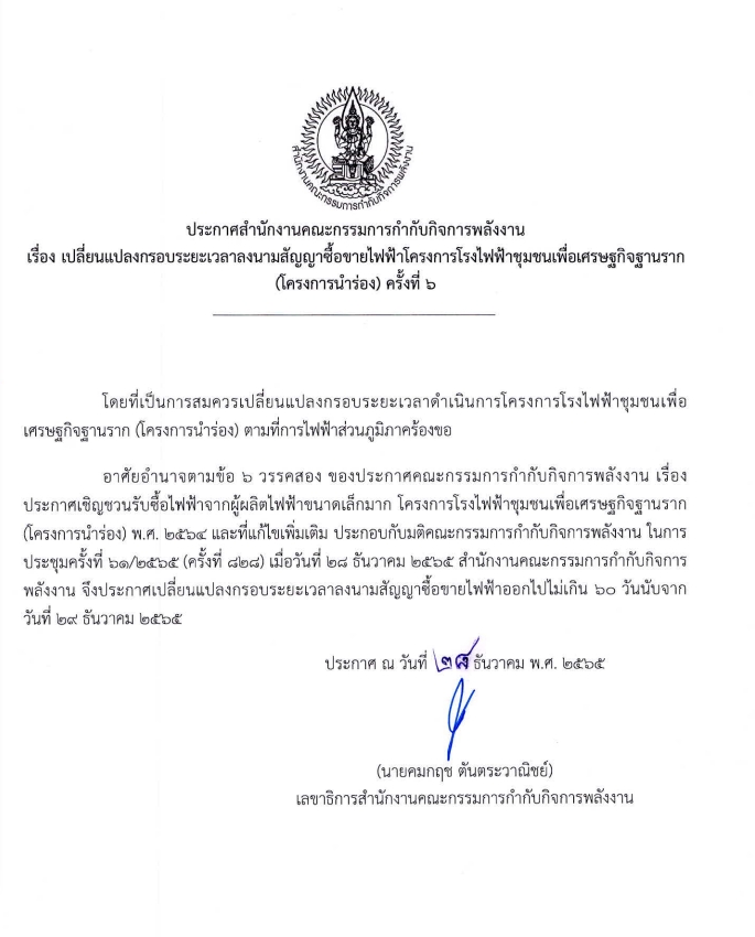 นายคมกฤช ตันตระวาณิชย์ เลขาธิการสำนักงานคณะกรรมการกำกับกิจการพลังงาน (สำนักงาน กกพ.) ในฐานะโฆษก คณะกรรมการกำกับกิจการพลังงาน (กกพ.) เปิดเผยว่า จากการประชุม บอร์ด กกพ. ครั้งที่ 61/2565 (ครั้งที่ 828) เมื่อวันที่ 28 ธันวาคม 2565 ที่ผ่านมา ได้มีมติเห็นชอบประกาศเปลี่ยนแปลงกรอบระยะเวลาลงนามสัญญาซื้อขายไฟฟ้า โครงการโรงไฟฟ้าชุมชนเพื่อเศรษฐกิจฐานราก (โครงการนำร่อง) ครั้งที่ 6 เพื่อขยายระยะเวลาลงนามสัญญาจากประกาศเดิมที่จะสิ้นสุดในวันที่ 29 ธันวาคม 2565 ออกไปอีก 60 วันไปสิ้นสุดวันที่ 27 กุมภาพันธ์ 2566 ตามที่การไฟฟ้าส่วนภูมิภาค (กฟภ.) เสนอ