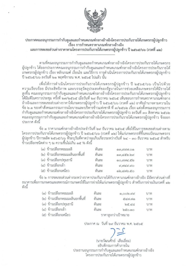 คณะอนุกรรมการฯ ได้พิจารณาราคาเกณฑ์กลางอ้างอิงและการชดเชยส่วนต่างราคาตามโครงการประกันรายได้เกษตรกรผู้ปลูกข้าว ปี 2565/66 งวดที่ 12 สำหรับเกษตรกรกว่าสองหมื่นรายที่แจ้งวันเก็บเกี่ยวระหว่างวันที่ 24 – 30 ธ.ค. 2565 โดยมีราคาเกณฑ์กลางอ้างอิงและส่วนต่าง ดังนี้ 1) ข้าวเปลือกหอมมะลิ เกณฑ์กลางตันละ 13,997.01 บาท ชดเชยตันละ 1,002.99 บาท ได้รับชดเชยสูงสุดครัวเรือนละ 14,041.86 บาท 2) ข้าวเปลือกหอมมะลินอกพื้นที่ เกณฑ์กลางตันละ 13,452.29 บาท ชดเชยตันละ 547.71 บาท ได้รับชดเชยสูงสุดครัวเรือนละ 8,763.36 บาท 3) ข้าวเปลือกปทุมธานี เกณฑ์กลางตันละ 10,974.52 บาท ชดเชยตันละ 25.48 บาท ได้รับชดเชยสูงสุดครัวเรือนละ 637.00 บาท 4) ข้าวเปลือกเจ้า เกณฑ์กลางตันละ 9,749.90 บาท ชดเชยตันละ 250.10 บาท ได้รับชดเชยสูงสุดครัวเรือนละ 7,503.00 บาท และ 5) ข้าวเปลือกเหนียว เกณฑ์กลางตันละ 12,476.50 บาท ซึ่งสูงกว่าราคาเป้าหมายที่ตันละ 12,000 บาท จึงไม่มีการชดเชยส่วนต่างในงวดนี้