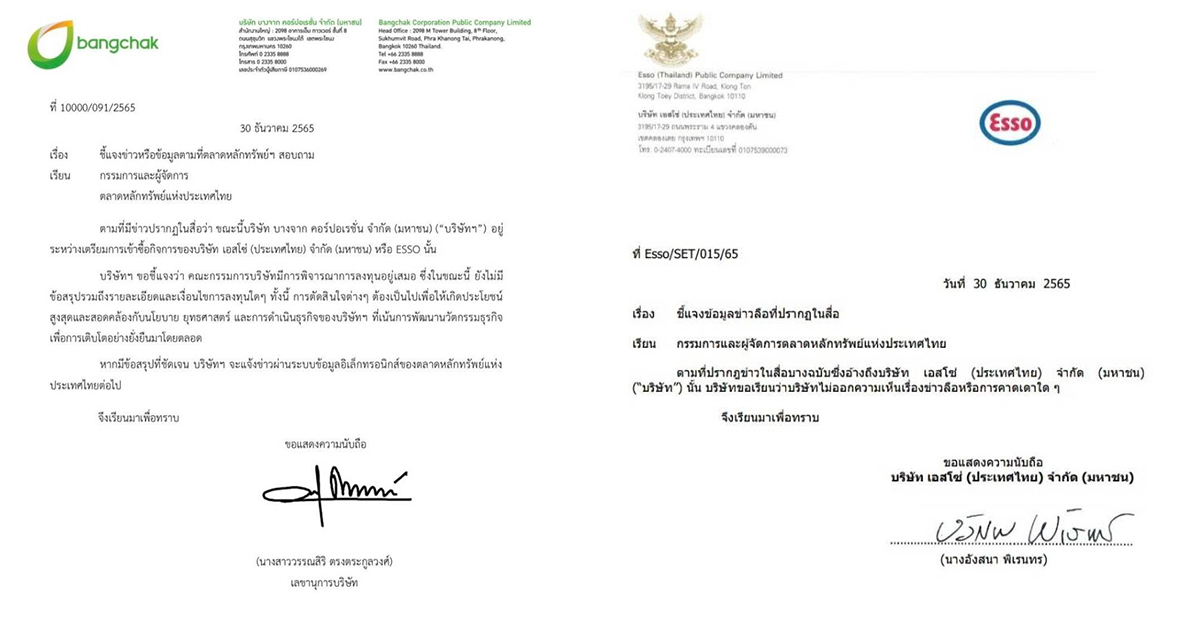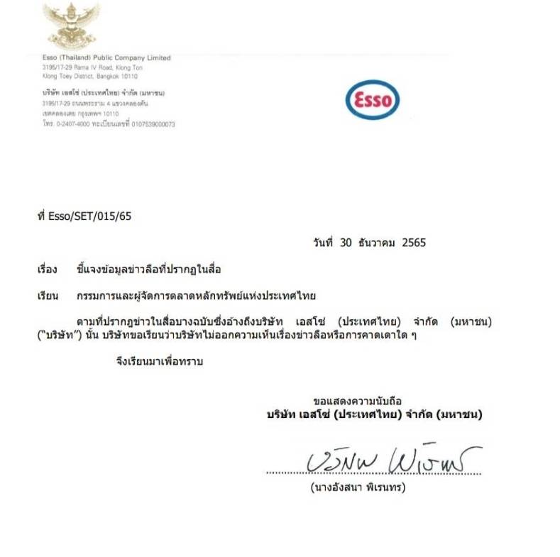 ด้าน บริษัท เอสโซ่ (ประเทศไทย) จำกัด (มหาชน) ชี้แจงว่าที่ปรากฎข่าวในสื่อบางฉบับซึ่งอ้างถึงบริษัท เอสโซ (ประเทศไทย) จำกัด (มหาชน) นั้น บริษัทขอเรียนว่าบริษัทไม่ออกความเห็นเรื่องข่าวลือหรือการคาดเดาใด ๆ -สำนักข่าวไทย