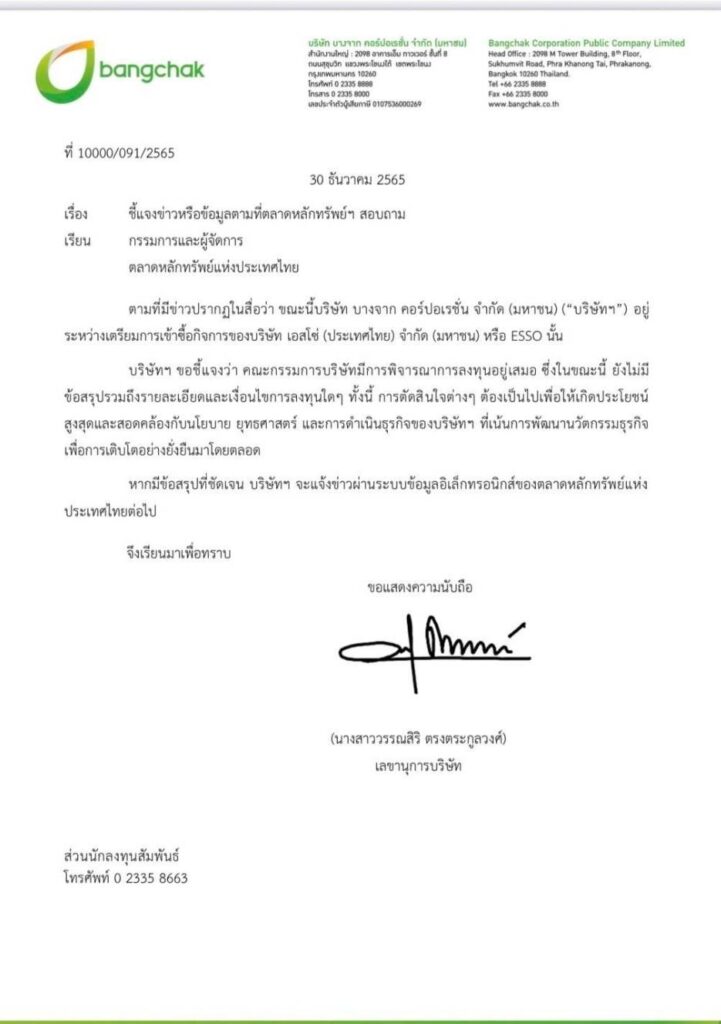 บริษัท บางจาก คอร์ปอเรชั่น จำกัด (มหาชน) ชี้แจงถึงตลาดหลักทรัพย์แห่งประเทศไทยตามที่มีข่าวปรากฏในสื่อว่า ขณะนี้บริษัท อยู่ระหว่างเตรียมการเข้าซื้อกิจการของบริษัท เอสโซ่ (ประเทศไทย) จำกัด (มหาชน) หรือ ESSO นั้นบริษัทฯ ขอชี้แจงว่า คณะกรรมการบริษัทมีการพิจารณาการลงทุนอยู่เสมอ ซึ่งในขณะนี้ ยังไม่มีข้อสรุปรวมถึงรายละเอียดและเงื่อนไขการลงทุนใดๆ