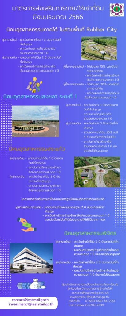 นิคมอุตสาหกรรมภาคใต้ในส่วนพื้นที่รับเบอร์ซิตี้ จ.สงขลา ผู้เช่ารายใหม่จะได้รับการยกเว้นค่าเช่าที่ดิน 1 ปี นับจากวันที่ทำสัญญา และได้รับการยกเว้นค่าบริการบำรุงรักษาสิ่งอำนวยความสะดวก 1 ปี นับตั้งแต่วันที่ได้รับอนุญาตให้ใช้ที่ดิน ส่วนผู้เช่ารายเดิมได้รับการยกเว้นค่าเช่าที่ดิน 2 ปี นับจากวันที่ทำสัญญา และได้รับการยกเว้นค่าบริการบำรุงรักษาสิ่งอำนวยความสะดวกเป็นระยะเวลา 1 ปี นับตั้งแต่วันที่ได้รับอนุญาตให้ใช้ที่ดิน