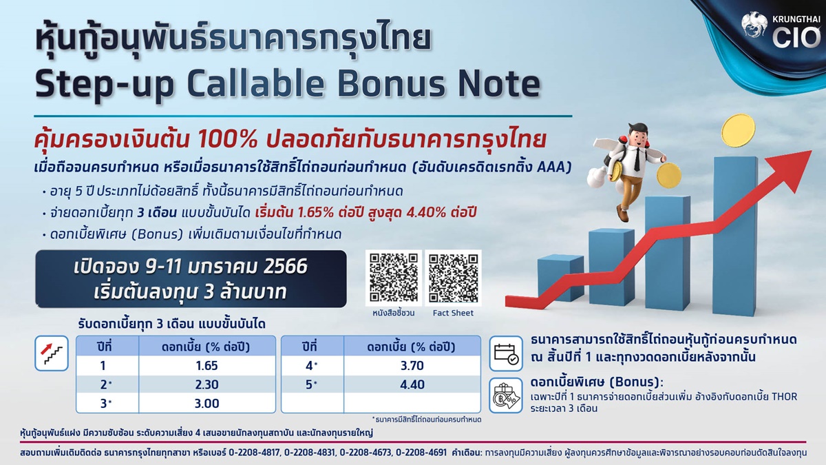 จากความสำเร็จและผลตอบรับที่ดี ธนาคารได้ออกและเสนอขายหุ้นกู้อนุพันธ์แฝงรุ่นใหม่ “หุ้นกู้อนุพันธ์กรุงไทย Step-up Callable Bonus Note” อายุ 5 ปี ประเภทไม่ด้อยสิทธิ เพื่อเปิดโอกาสให้ผู้ลงทุนสร้างผลตอบแทนการลงทุนตั้งแต่ต้นปี 2566 ยังคงจุดแข็งคุ้มครองเงินต้น 100% โดยธนาคารกรุงไทย ที่มีอันดับเครดิตระดับ AAA จ่ายดอกเบี้ยคงที่แบบขั้นบันไดทุก 3 เดือน ตลอดระยะเวลาการถือครอง ดอกเบี้ยเริ่มต้น 1.65% ต่อปี 2.30% ต่อปี 3.00% ต่อปี 3.70% ต่อปี และ 4.40% ต่อปี ตามลำดับ ดอกเบี้ยเฉลี่ยทั้งโครงการกรณีธนาคารไม่ใช้สิทธิไถ่ถอนก่อนกำหนดเท่ากับ 3.01% ต่อปี และมีดอกเบี้ยพิเศษ (Bonus) อ้างอิงอัตราดอกเบี้ย THOR ในปีที่ 1 ในกรณีเข้าเงื่อนไขที่กำหนด ทั้งนี้ ธนาคารสามารถไถ่ถอนก่อนกำหนดได้หลังปีที่ 1 เป็นต้นไป และทุกงวดการจ่ายดอกเบี้ยตลอดครบอายุสัญญา ผลตอบแทนที่ได้รับจาก “หุ้นกู้อนุพันธ์กรุงไทย Step-up Callable Bonus Note” มีโอกาสสูงกว่าทางเลือกการลงทุนอื่นประเภทไม่ด้อยสิทธิที่มีอันดับเครดิตใกล้เคียงกัน