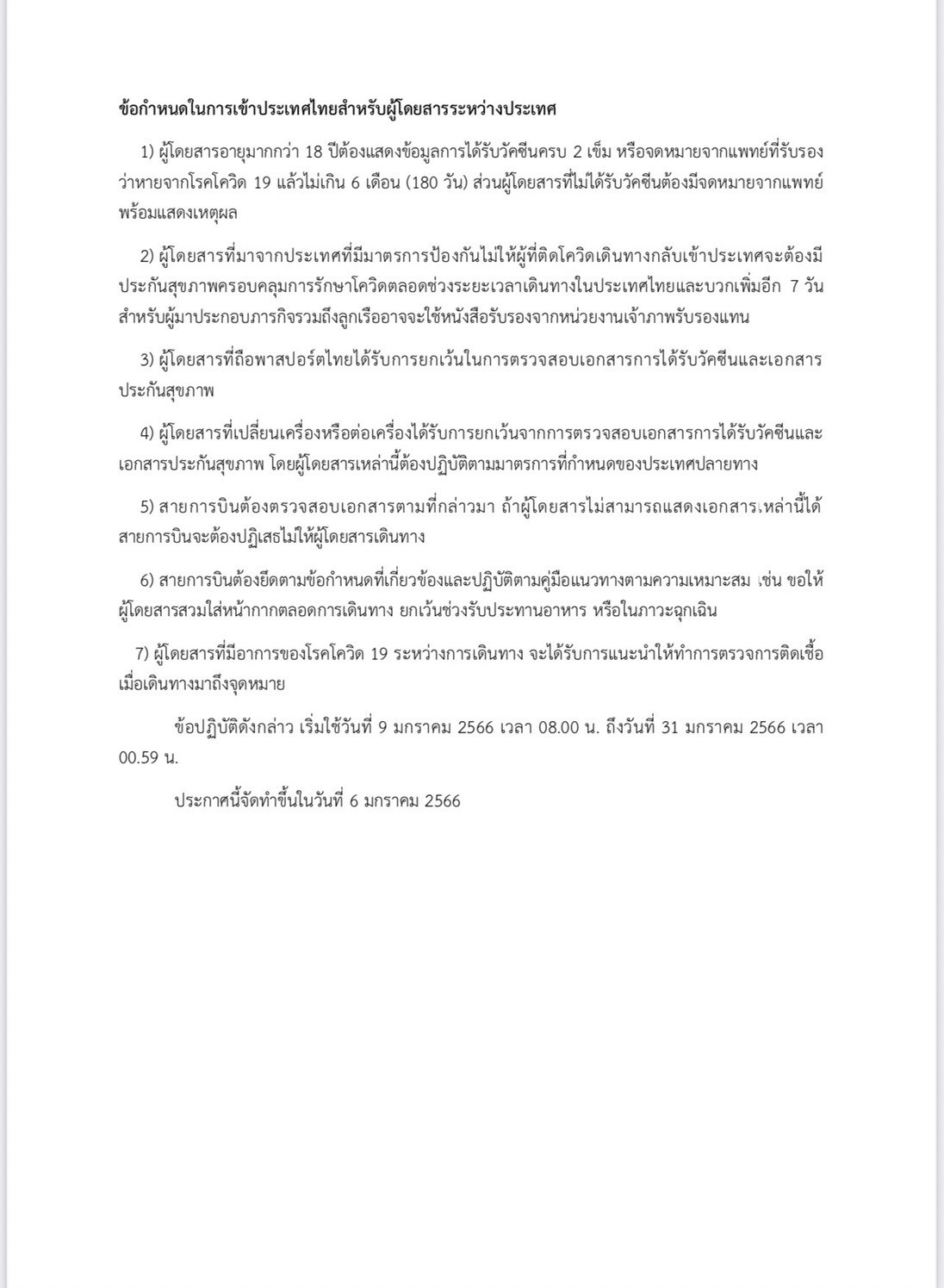 - ผู้โดยสารที่ถือพาสปอร์ตไทยได้รับการยกเว้นในการตรวจสอบเอกสารการได้รับวัคซีนและเอกสารประกันสุขภาพ