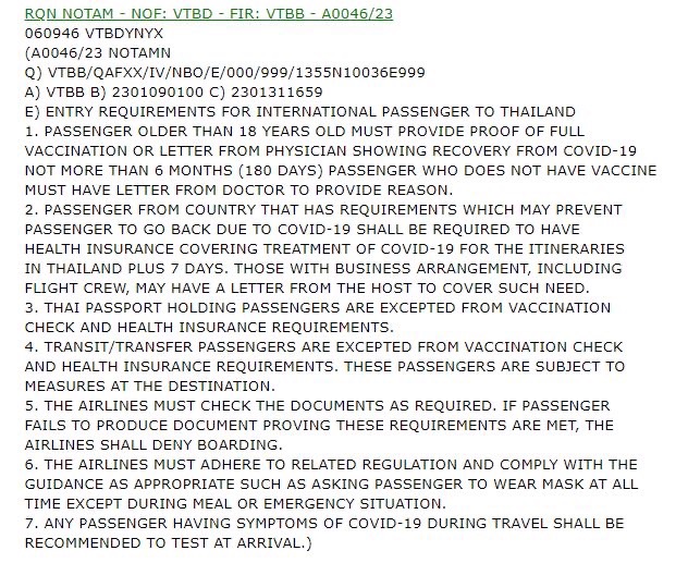 นายศักดิ์สยาม ชิดชอบ รัฐมนตรีว่าการกระทรวงคมนาคม เปิดเผยว่า ล่าสุดสำนักงานการบินพลเรือนแห่งประเทศไทย (กพท.) ได้ออกประกาศ NOTAM by CAAT January 6, 2023 หรือ ข้อกำหนดในการเข้าประเทศไทยสำหรับผู้โดยสารระหว่างประเทศ โดยมีหลักเกณฑ์สำคัญประกอบด้วย