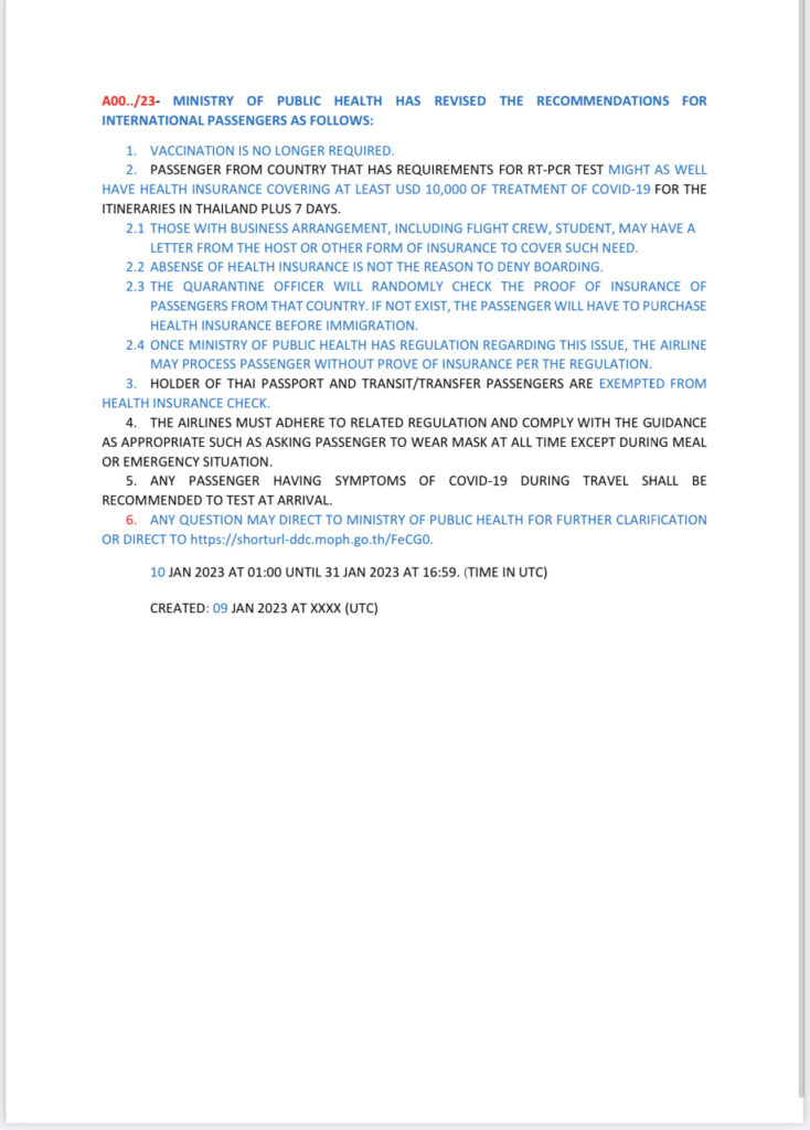 สำนักงานการบินพลเรือนแห่งประเทศไทย (กพท.) ได้ออกประกาศ NOTAM ฉบับปรับปรุงใหม่ (จากฉบับเดิมA0055/23 ออกเมื่อวันที่ 7 ม.ค. 2566) เพื่อให้สอดคล้องกับแนวทางของ กระทรวงสาธารณสุข ปรับมาตรการในการเข้าประเทศไทยสำหรับผู้โดยสารระหว่างประเทศ ดังนี้