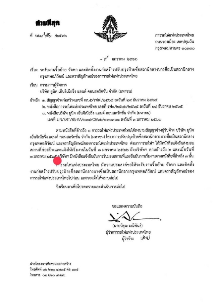 ตามหนังสือที่อ้างถึงการรถไฟแห่งประเทศไทยได้ลงนามสัญญาจ้างผู้รับจ้าง บริษัทยูนิคเอ็นจิเนียริ่ง แอนด์ คอนสตรัคชั่น จำกัด (มหาชน) โครงการปรับปรุงป้ายชื่อสถานีกลางบางซื่อ เป็นสถานีกลางกรุงเทพอภิวัฒน์ และตราสัญลักษณ์ของการรถฟแห่งประเทศไทย ต่อมาการรถไฟฯ ได้มีหนังสือแจ้งวันส่งมอบสถานที่ก่อสร้างและแจ้งให้เริ่มงานในวันที่ 3 ม.ค.2566 ถึงบริษัทฯ ตามอ้างถึง และเมื่อวันที่ 3 ม.ค.2566 บริษัทๆ มีหนังสือแจ้งยืนยันการรับมอบสถานที่และยืนยันการเริ่มงานตามหนังสือที่อ้างถึงนั้น โดยการรถไฟฯ มีความประสงค์ขอให้ระงับงานรื้อย้าย จัดหาและติดตั้งงานก่อสร้างปรับปรุงป้ายชื่อสถานีกลางบางซื่อ เป็นสถานีกลางกรุงเทพอภิวัฒน์ และตราสัญลักษณ์ของการรถไฟแห่งประเทศไทยไปก่อน และจะแจ้งให้ทราบต่อไป