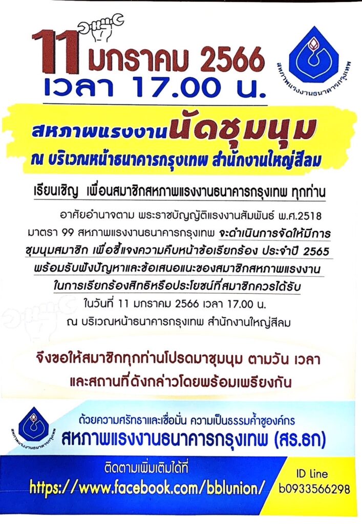 นายบัณฑิต จันทร์แก้วแร่ ประธานสหภาพแรงงานธนาคารกรุงเทพ เปิดเผยว่า ในวันพรุ่งนี้ (11 ม.ค.) สหภาพฯได้แจ้งสมาชิก มาชุมนุมร่วมกัน เพื่อชี้แจงความคืบหน้าข้อเรียกร้อง ประจำปี 2565พร้อมรับฟังปัญหาและข้อเสนอแนะของสมาชิกสหภาพแรงงานในการเรียกร้องสิทธิหรือประโยชน์ที่สมาชิกควรได้รับ โดยนัดพบกันในวันที่ 11 มกราคม2566 เวลา 17.00 น.ณ บริเวณหน้าธนาคารกรุงเทพ สำนักงานใหญ่สีลม