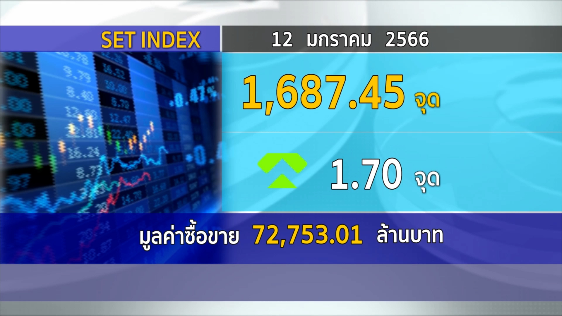 กทม. 12 ม.ค.- SET ปิดวันนี้ที่ 1,687.45 จุด เพิ่มขึ้น 1.70 จุด (+0.10%) มูลค่าการซื้อขาย 72,809.15 ล้านบาท