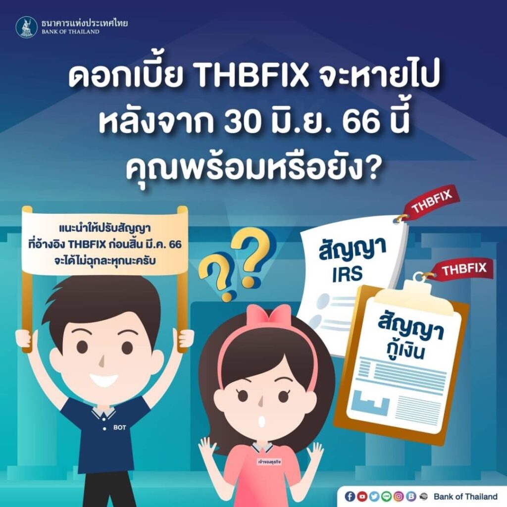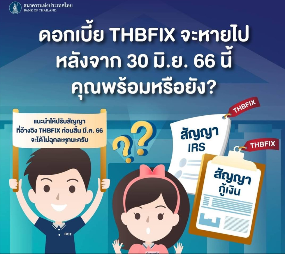 ตามที่ธนาคารแห่งประเทศไทย (ธปท.) จะยุติการเผยแพร่อัตราดอกเบี้ย Thai Baht Interest Rate Fixing (THBFIX) หลังเดือนมิถุนายน 2566 เป็นต้นไป ซึ่ง ธปท. ได้สนับสนุนให้ธนาคารและธุรกิจคู่สัญญาเจรจาตกลงเพื่อเปลี่ยนสัญญาไปอ้างอิงอัตราดอกเบี้ยอื่นก่อนการหยุดเผยแพร่ THBFIX มาอย่างต่อเนื่องนั้น ที่ผ่านมา พบว่าการเจรจาเป็นไปอย่างล่าช้า ซึ่งสาเหตุอาจมาจากการรอจังหวะที่ภาวะตลาดเอื้ออำนวย หรือการหาข้อสรุปร่วมทำได้ยากกรณีมีหลายผู้ให้กู้ อย่างไรก็ตาม ด้วยสภาพคล่องของธุรกรรมอัตราดอกเบี้ย THBFIX ที่ลดลงตามระยะเวลาที่เหลือ อาจทำให้โอกาสที่จะปรับเปลี่ยนสัญญาไม่ทันมีมากขึ้น
