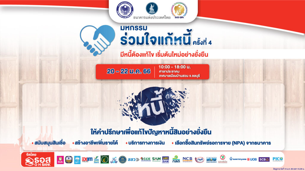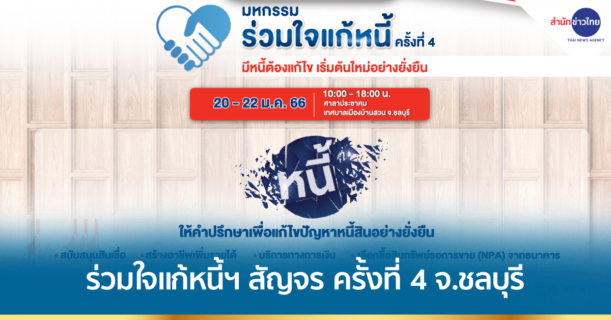 กรุงเทพฯ 13 ม.ค. – ธอส. ผนึกกำลังสถาบันการเงิน จัดงานร่วมใจแก้หนี้ฯ สัญจร ครั้งที่ 4 จ.ชลบุรี ขนมาตรการแก้ไขหนี้ เติมเงิน เสริมสภาพคล่องช่วยเหลือประชาชน วันที่ 20-22 มกราคม 2566 ณ ศาลาประชาคมเทศบาลเมืองบ้านสวน จ.ชลบุรี