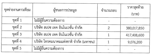 ศาสตราจารย์คลินิก นพ.สรณ บุญใบชัยพฤกษ์ ประธานกรรมการกิจการกระจายเสียง กิจการโทรทัศน์ และกิจการโทรคมนาคมแห่งชาติ (กสทช.) กรรมการกสทช. และรักษาการแทนเลขาธิการ กสทช. ได้แถลงผลการประมูลว่า บริษัท สเปซ เทค อินโนเวชั่น จำกัดชนะการประมูลในชุดข่ายงานดาวเทียมที่ 2 และ3 บริษัท โทรคมนาคมแห่งชาติ จำกัด (มหาชน) ชนะการประมูลชุดที่ 4 ส่วน 1 และ 5 ไม่มีผู้ยื่นความต้องการ โดยชุดที่ 2 เคาะ 2 รอบ ราคาสุดท้าย 380,017,850 บาท ชุดที่ 3 เคาะ 1 รอบ ราคาสุดท้าย 417,408,600 บาท ชุดที่ 4 เคาะ 1 รอบ ราคาสุดท้าย 9,076,200 บาท ทำให้ราคาประมูลชุดข่ายงานดาวเทียม 3 ชุดรวม 806,502,650 บาท