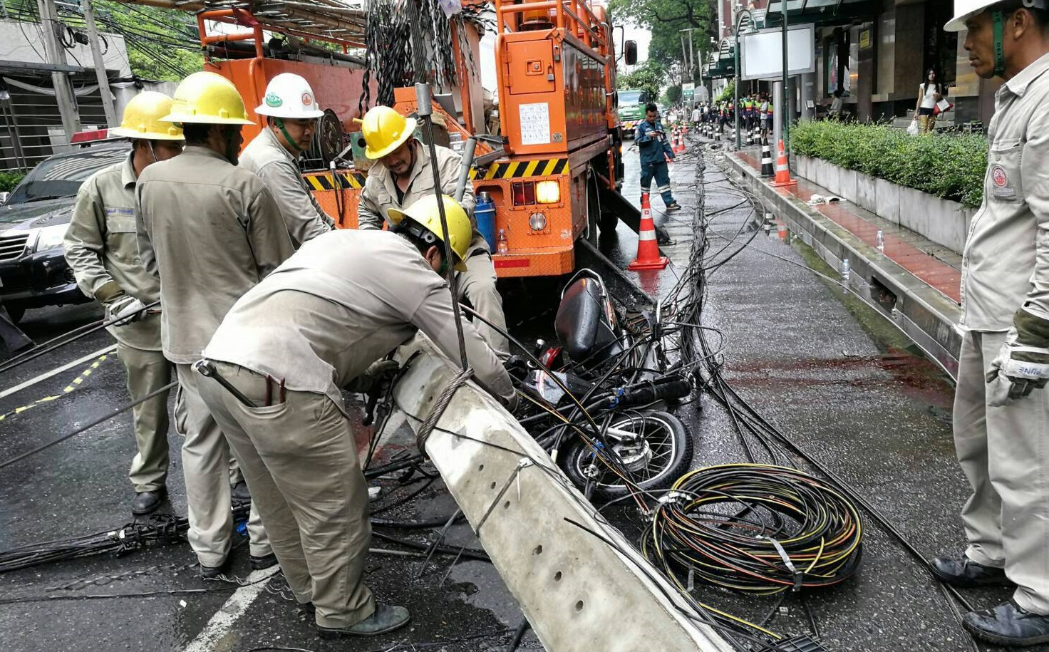 ที่เกิดเหตุพบผู้เสียชีวิต 1 คน จากเสาสายสื่อสาร TOT ล้มทับ และมีผู้ได้รับบาดเจ็บ จำนวน 1 คน มีรถยนต์ของประชาชนเสียหาย จำนวน 5 คัน ในเบื้องต้น กฟน. จะมอบเงินช่วยเหลือเยียวยาให้แก่ครอบครัวผู้เสียชีวิตจำนวนหนึ่งหมื่นบาท โดยเหตุการณ์ดังกล่าวไม่ส่งผลกระทบต่อระบบไฟฟ้า และไม่มีไฟฟ้าดับ เนื่องจากบริเวณดังกล่าว กฟน. ได้ดำเนินการจ่ายไฟฟ้าด้วยระบบสายไฟฟ้าใต้ดินทั้งหมดแล้ว