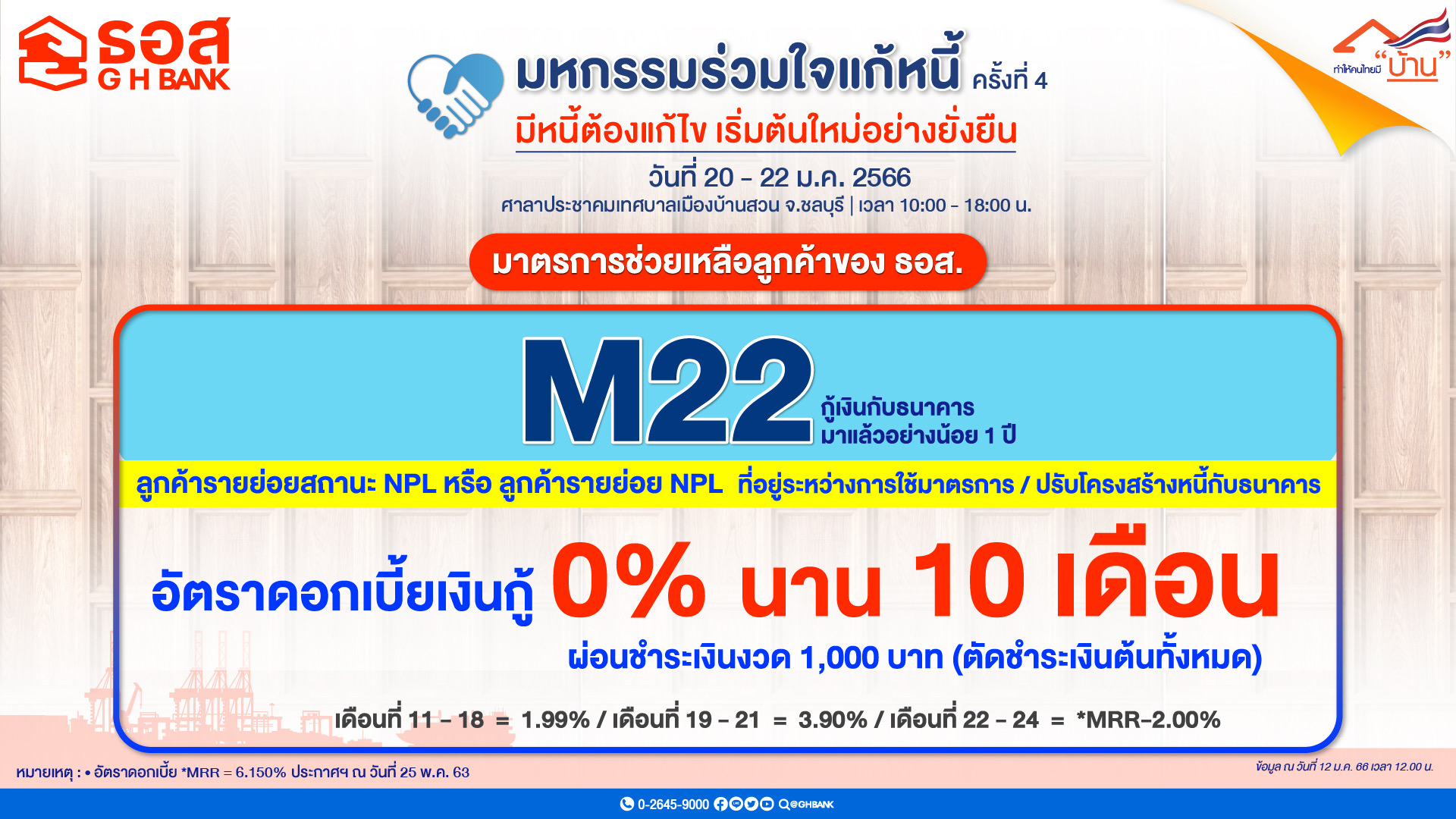 ธนาคารอาคารสงเคราะห์(ธอส.) ร่วมงาน “มหกรรมร่วมใจแก้หนี้ มีหนี้ต้องแก้ไข เริ่มต้นใหม่อย่างยั่งยืน” สัญจร ครั้งที่ 4 ระหว่างวันที่ 20-22 มกราคม 2566 ณ ศาลาประชาคมเทศบาลเมืองบ้านสวน จ.ชลบุรี เพื่อให้ความช่วยเหลือลูกค้าปัจจุบันที่ยังได้รับผลกระทบด้านรายได้ นำโดย มาตรการ 22 [M22] : สำหรับลูกค้ารายย่อยสถานะ NPL หรือลูกค้ารายย่อยสถานะ NPL ที่อยู่ระหว่างการใช้มาตรการ/ปรับโครงสร้างหนี้ ที่กู้เงินกับธนาคารมาแล้วไม่น้อยกว่า 1 ปีให้ผ่อนชำระเงินงวดต่ำพร้อมลดอัตราดอกเบี้ยเงินกู้พิเศษ ระยะเวลา 2 ปี แบ่งเป็น ในเดือนที่ 1-10 ผ่อนชำระเพียงงวดละ 1,000 บาท คิดดอกเบี้ยเท่ากับ 0% ต่อปี (ตัดชำระเงินต้นทั้งหมด) เดือนที่ 11-18 คิดเงินงวดจากอัตราดอกเบี้ย 1.99% ต่อปี และเดือนที่ 19-21 คิดเงินงวดจากอัตราดอกเบี้ย 3.90% ต่อปี เดือนที่ 22-24 คิดเงินงวดจากอัตราดอกเบี้ย MRR-2.00% ต่อปี