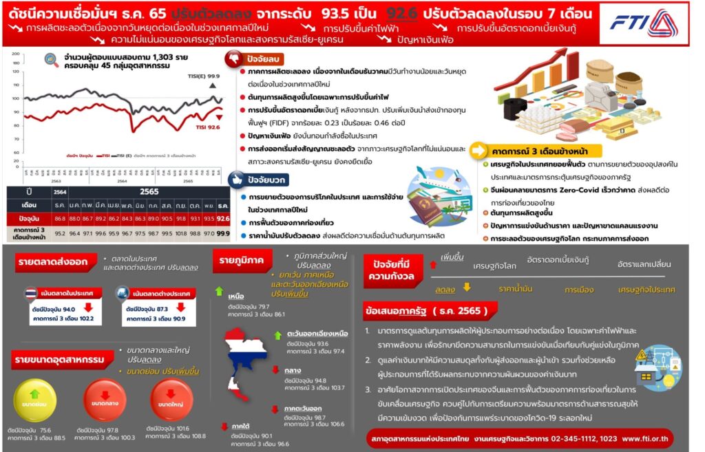 ทั้งนี้ ผู้ประกอบการยังมีความกังวลเกี่ยวกับต้นทุนการผลิตโดยเฉพาะการปรับขึ้นค่าไฟฟ้า และการปรับขึ้นอัตราดอกเบี้ยเงินกู้ หลังจากธนาคารแห่งประเทศไทย (ธปท.) ประกาศปรับขึ้นอัตราเงินนำส่งจากสถาบันการเงินเข้ากองทุนเพื่อการฟื้นฟูและพัฒนาระบบสถาบันการเงิน (FIDF) จากร้อยละ 0.23 เป็นร้อยละ 0.46 ต่อปี ส่งผลให้ต้นทุนการเงินเพิ่มขึ้น ขณะที่ปัญหาเงินเฟ้อที่ยังบั่นทอนกำลังซื้อในประเทศ ในด้านการส่งออกเริ่มส่งสัญญาณชะลอตัว จากภาวะเศรษฐกิจโลกที่ไม่แน่นอนและสภาวะสงครามรัสเซีย-ยูเครนที่ยังคงยืดเยื้อ อย่างไรก็ตาม เดือนธันวาคมยังมีปัจจัยบวกจากการขยายตัวของการบริโภคในประเทศ และการใช้จ่ายในช่วงเทศกาลปีใหม่ รวมทั้งการฟื้นตัวของภาคการท่องเที่ยว ขณะที่ราคาน้ำมันปรับตัวลดลงส่งผลดีต่อความเชื่อมั่นด้านต้นทุนการผลิต