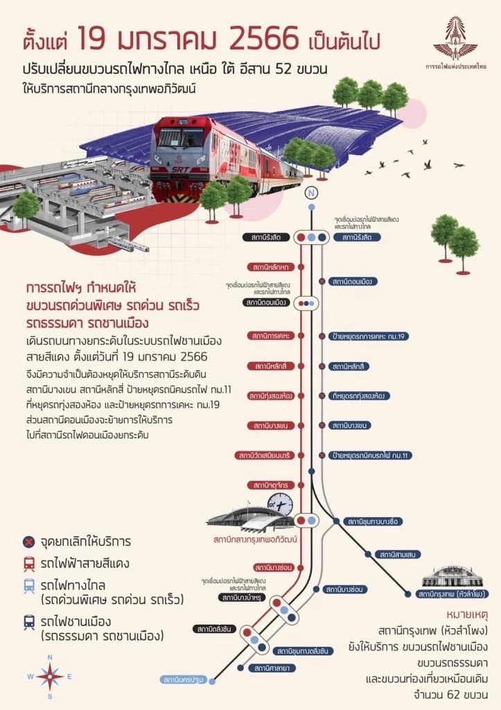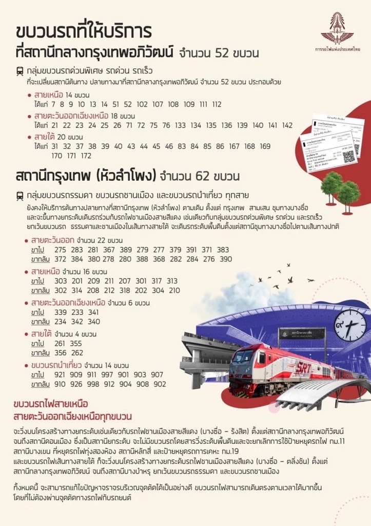 การรถไฟแห่งประเทศไทย จึงขอชี้แจงในประเด็นต่างๆ เพื่อให้เกิดความเข้าใจที่ถูกต้องดังนี้ การรถไฟฯ ยืนยันว่าการปรับเปลี่ยนต้นทาง-ปลายทางจากสถานีกรุงเทพ (หัวลำโพง) มาให้บริการ ณ สถานีกลางกรุงเทพอภิวัฒน์ ได้มีการพิจารณาไตร่ตรองอย่างถี่ถ้วนและรอบคอบ โดยยึดถือในประโยชน์ของประชาชนผู้ใช้บริการควบคู่กับการพัฒนาระบบการขนส่งทางรางของประเทศในระยะยาวเป็นสำคัญ