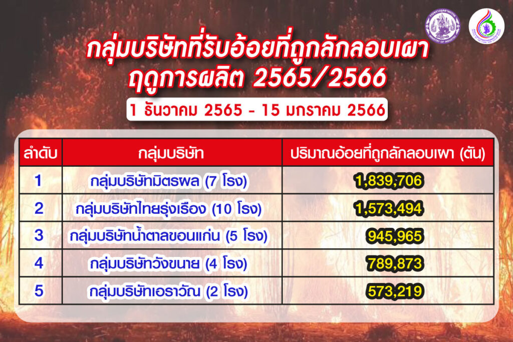 จากข้อมูลลักลอบเผาตั้งแต่วันที่ 1 ธันวาคม 2565 ถึงวันที่ 15 มกราคม 2566 ยังพบว่ามี 5 จังหวัดที่เผาอ้อยสูงสุด ดังนี้ นครราชสีมา 1.2 ล้านตัน อุดรธานี 0.78 ล้านตัน กาฬสินธุ์ 0.76 ล้านตัน ขอนแก่น 0.66 ล้านตัน และสุพรรณบุรี 0.57 ล้านตัน ตามลำดับ ขณะที่ 5 กลุ่มบริษัทที่รับอ้อยเผามากสุด ดังนี้ กลุ่มบริษัทมิตรผล (7 โรง) 1.83 ล้านตัน กลุ่มบริษัทไทยรุ่งเรือง(10 โรง) 1.57 ล้านตัน กลุ่มบริษัทน้ำตาลขอนแก่น (5 โรง) 0.94 ล้านตัน กลุ่มบริษัทวังขนาย (4 โรง) 0.78 ล้านตัน และกลุ่มบริษัทเอราวัณ (2 โรง) 0.57 ล้านตัน.-สำนักข่าวไทย
