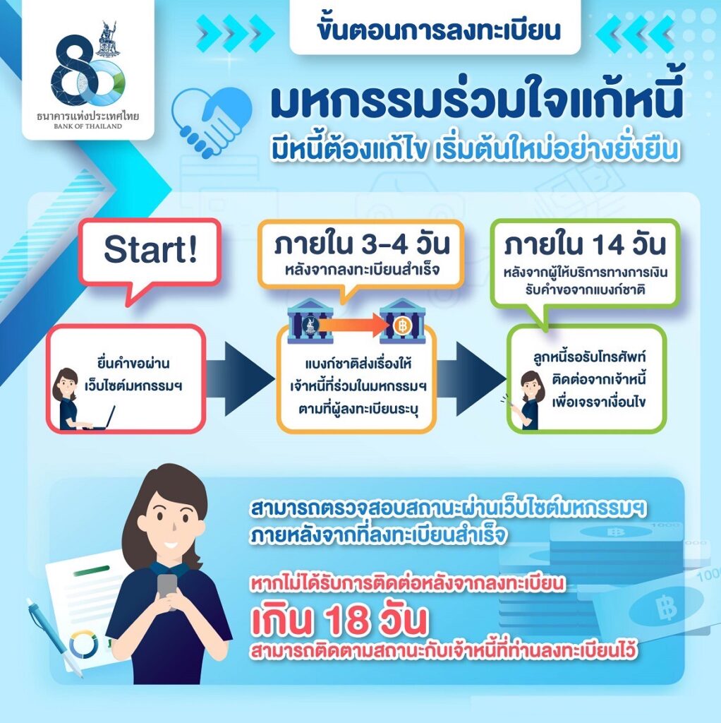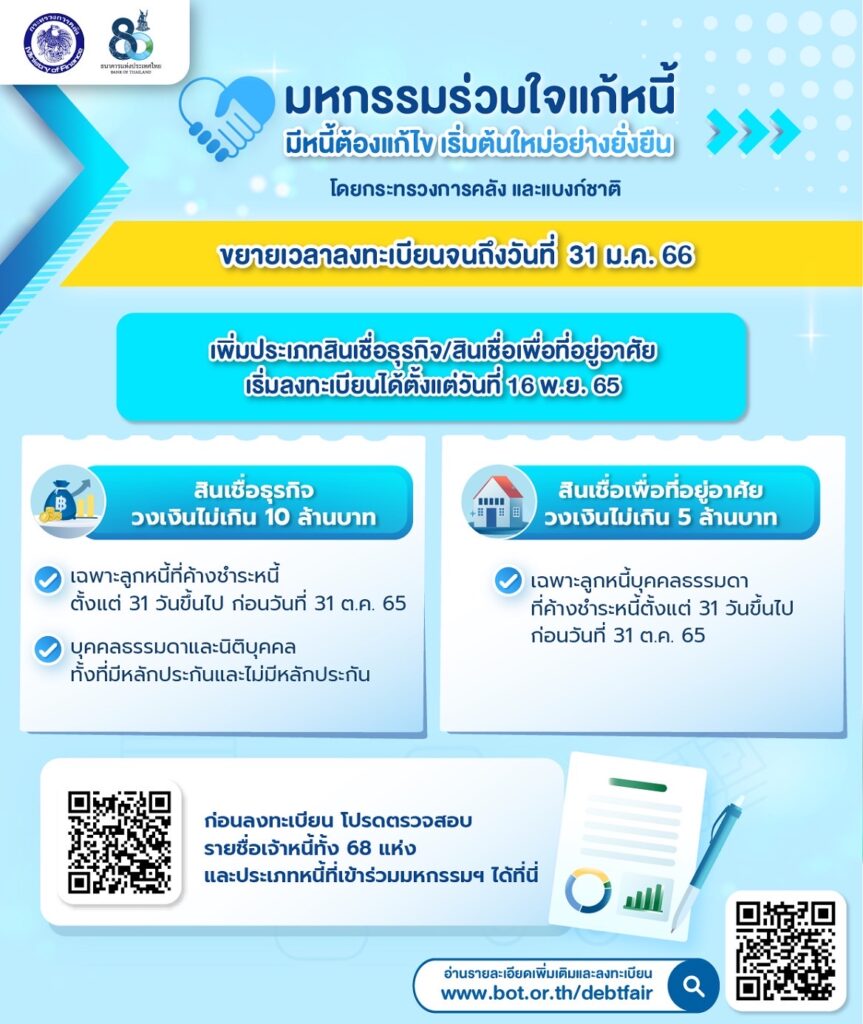 นอกจากนี้ เพื่อให้การแก้ไขปัญหาหนี้สินให้แก่ประชาชนทำได้อย่างต่อเนื่องและครอบคลุมประชาชนในทุกพื้นที่ทั่วประเทศ ธนาคารแห่งประเทศไทยได้เปิดระบบลงทะเบียนปรับปรุงโครงสร้างหนี้ออนไลน์ และขยายระยะเวลาลงทะเบียนออนไลน์จนถึงวันที่ 31 มกราคม 2566 จากเดิมสิ้นสุดวันที่ 30 พฤศจิกายน 2565 โดยผู้ที่สนใจสามารถลงทะเบียนเพื่อขอแก้ไขหรือปรับปรุงโครงสร้างหนี้ผ่านระบบออนไลน์ได้จนถึงวันที่ 31 มกราคม 2566 ได้ทางเว็บไซต์https://www.bot.or.th/DebtFair หรือ Scan QR Code และคาดหวังว่าการจัดงานในครั้งที่ 4 นี้จะได้รับความสนใจจากประชาชนและผู้ประกอบการเช่นเดียวกับการจัดงานครั้งที่ผ่านมา.-สำนักข่าวไทย
