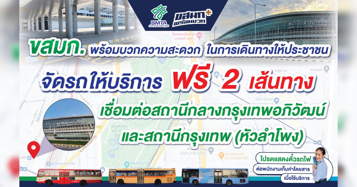 กรุงเทพฯ 19 ม.ค. – กระทรวงคมนาคม ย้ำมีสิ่งอำนวยความสะดวกการเดินทางให้ประชาชน จัดรถ Shuttle Bus และรถเฉพาะกิจให้บริการฟรี 2 เส้นทาง เชื่อมต่อสถานีกลางกรุงเทพอภิวัฒน์และสถานีกรุงเทพ (หัวลำโพง)