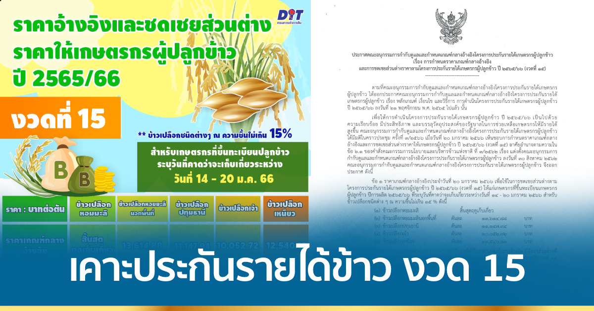 นายอุดม ศรีสมทรง รองอธิบดีกรมการค้าภายใน เปิดเผยว่า คณะอนุกรรมการกำกับดูแลและกำหนดเกณฑ์กลางอ้างอิงโครงการประกันรายได้เกษตรกรผู้ปลูกข้าว ได้พิจารณาราคาเกณฑ์กลางอ้างอิงและการชดเชยส่วนต่างราคาตามโครงการประกันรายได้เกษตรกรผู้ปลูกข้าว ปี 2565/66 งวดที่ 15 สำหรับเกษตรกรสี่พันกว่ารายที่แจ้งวันเก็บเกี่ยวระหว่างวันที่ 14 – 20 ม.ค. 2566 ปรากฏว่า มีราคาเกณฑ์กลางอ้างอิงสูงกว่าราคาเป้าหมายประกันรายได้เกือบทุกชนิดข้าว โดยมีเพียงข้าวเปลือกหอมมะลินอกพื้นที่ ซึ่งมีเกณฑ์กลางตันละ 13,614.88 บาท ที่เกษตรกรจะได้รับชดเชยส่วนต่างตันละ 385.12 บาท ได้รับชดเชยสูงสุดครัวเรือนละ 6,161.92 บาท สำหรับข้าวเปลือกเจ้า ข้าวเปลือกปทุมธานี และข้าวเปลือกเหนียว มีราคาเกณฑ์กลางอ้างอิงสูงกว่าราคาประกัน ดังนี้ ข้าวเปลือกปทุมธานี เกณฑ์กลางตันละ 11,147.94 บาท ข้าวเปลือกเจ้า เกณฑ์กลางตันละ 10,052.72 บาท และข้าวเปลือกเหนียว เกณฑ์กลางตันละ 12,540.13 บาท
