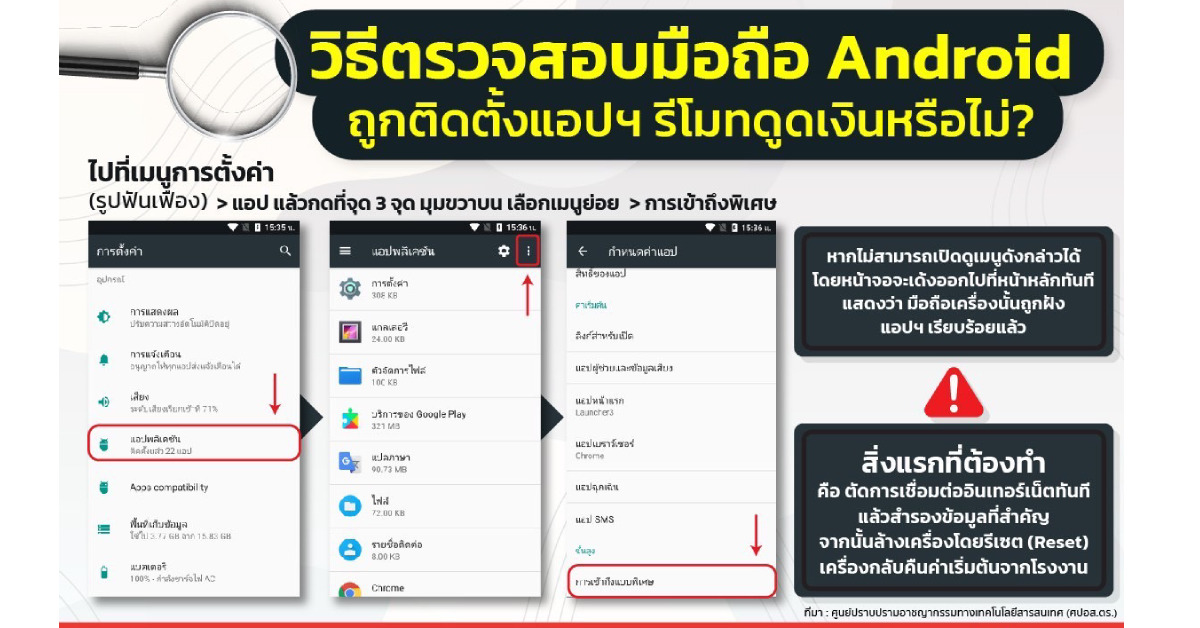 นางสาวรัชดา ธนาดิเรก รองโฆษกประจำสำนักนายกรัฐมนตรี เปิดเผยว่า สำนักงานตำรวจแห่งชาติ ศูนย์ปราบปรามอาชญากรรมทางเทคโนโลยีสารสนเทศ (ศปอส.ตร.) ได้แนะนำวิธีตรวจสอบมือถือระบบแอนดรอยด์ (Android) แก่ประชาชนว่าถูกติดตั้งแอปพลิเคชั่นรีโมทดูดเงินหรือไม่ เพื่อป้องกันตนเองไม่ให้ตกเป็นผู้เสียหายถูกขโมยข้อมูลและเงินผ่านมือถือ จากการพลั้งเผลอติดตั้งแอปพลิเคชั่นที่แฝงมัลแวร์ลงมือถือโดยไม่รู้ตัว เป็นการเปิดโอกาสให้มิจฉาชีพควบคุมมือถือจากระยะไกลและสวมรอยทำธุรกรรมการเงิน โดยโอนเงินออกจากบัญชีแทนเจ้าของได้