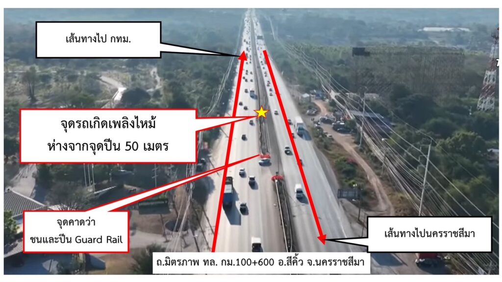 ทั้งนี้ พบว่า ข้อมูลสภาพแวดล้อมโดยทั่วไป สภาพถนน ณ จุดเกิดเหตุ มีลักษณะเป็นถนน 8 ช่องจราจร มี Guard Rail และร่องกลางถนนแบ่งช่องทางจราจร เป็นเนินและมีจุดกลับรถ ข้อมูลรถ เป็นรถตู้โดยสารไม่ประจำทาง 30-0078 อำนาจเจริญ จดทะเบียนเมื่อวันที่ 2 พ.ค.60 ชนิดเชื้อเพลิง CNG สลับเบนซิน จำนวน 13 ที่นั่ง ตรวจสภาพครั้งสุดท้าย 27 ต.ค.65 สิ้นอายุภาษี 31 มี.ค.66 ผู้ประกอบการ ห้างหุ้นส่วนจำกัด มนตรีทรัพย์เจริญ ข้อมูล GPS จากการตรวจข้อมูลในระบบ GPS ความเร็วของรถตู้โดยสารไม่ประจำทาง ก่อนเกิดเหตุอยู่ที่ 82 กม./ชม. สภาพรถเกิดเพลิงไหม้สิ้นเชิง สภาพตัวรถโดยทั่วไปทั้งด้านซ้ายและขวาไม่พบรอยกระแทก สำรวจที่ด้านหน้ารถพบรอยฉีกขาดที่กันชนกับสแตนเลส รวมทั้งคานเหล็กด้านในของกันชนด้านหน้าตัวรถ บริเวณด้านล่างตำแหน่งประมาณกึ่งกลางตัวรถ ความสูงจากพื้นประมาณ 40 เซนติเมตรจากพื้นถนน ทะลุเข้าไปในตัวรถ โดยฝากระโปรงด้านบนไม่พบความเสียหายจากการกระแทก สำรวจที่ด้านใต้ท้องรถเพื่อตรวจสอบสภาพถังน้ำมันเชื้อเพลิง (ขนาดความจุเบนซิน 76 ลิตร) พบรอยฉีกขาดขนาดใหญ่ประมาณ 50 เซนติเมตร เป็นแนวตามยาวของตัวรถ ตรวจสอบระบบ CNG พบสภาพหัวถังยังคงสมบูรณ์ ท่อก๊าซไม่ฉีกขาด สภาพถัง Type II ไฟเบอร์ที่ใช้สำหรับเสริมแรงถูกไฟไหม้มีสภาพเสียหายเล็กน้อย