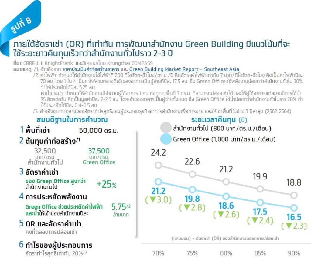 อย่างไรก็ตามสำนักงานประเภท Green Building หรือ “Green Office” ซึ่งก็คืออาคารสำนักงานที่มีการออกแบบและก่อสร้างโดยมุ่งหวังให้เป็นมิตรต่อสิ่งแวดล้อม และอนุรักษ์พลังงาน ยังเป็น Segment ที่มีความต้องการเช่าอย่างต่อเนื่องจากบริษัทขนาดใหญ่และบริษัทต่างชาติที่ให้ความสำคัญกับกระแส ESG โดย จากการประเมินพบว่า ด้วยจุดเด่นของ Green Office ทั้งการที่สามารถ 1) กำหนดอัตราค่าเช่าได้สูงกว่าสำนักงานทั่วไป 20-30% ประกอบกับ 2) การช่วยประหยัดค่าใช้จ่ายด้านพลังงานให้กับผู้ประกอบการ จะส่งผลให้การลงทุนพัฒนาโครงการสำนักงานใหม่ๆในรูปแบบ Green Office มีระยะเวลาคืนทุนที่เร็วกว่าสำนักงานทั่วไปราว 2-3 ปี