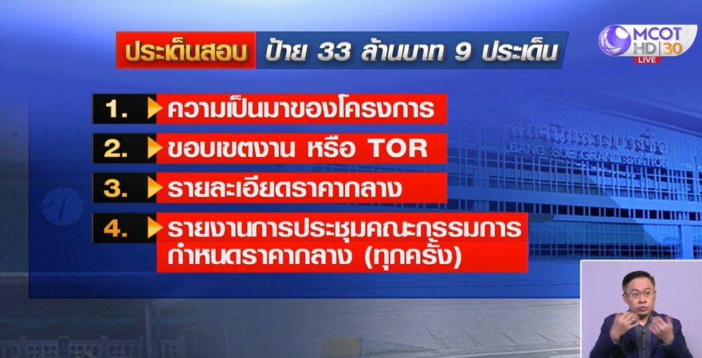 กรุงเทพฯ 24 ม.ค. – คณะกรรมการสอบข้อเท้จจริงกรณีโครงการปรับปรุงป้ายสถานีกลางบางซื่อ เป็นสถานีกลางกรุงเทพอภิวัฒน์ วงเงิน 33 ล้านบาท สรุปผลการสอบสวนแล้ววันนี้ โดยขอให้การรถไฟฯ ทบทวนโครงการจัดจ้างเอกชน