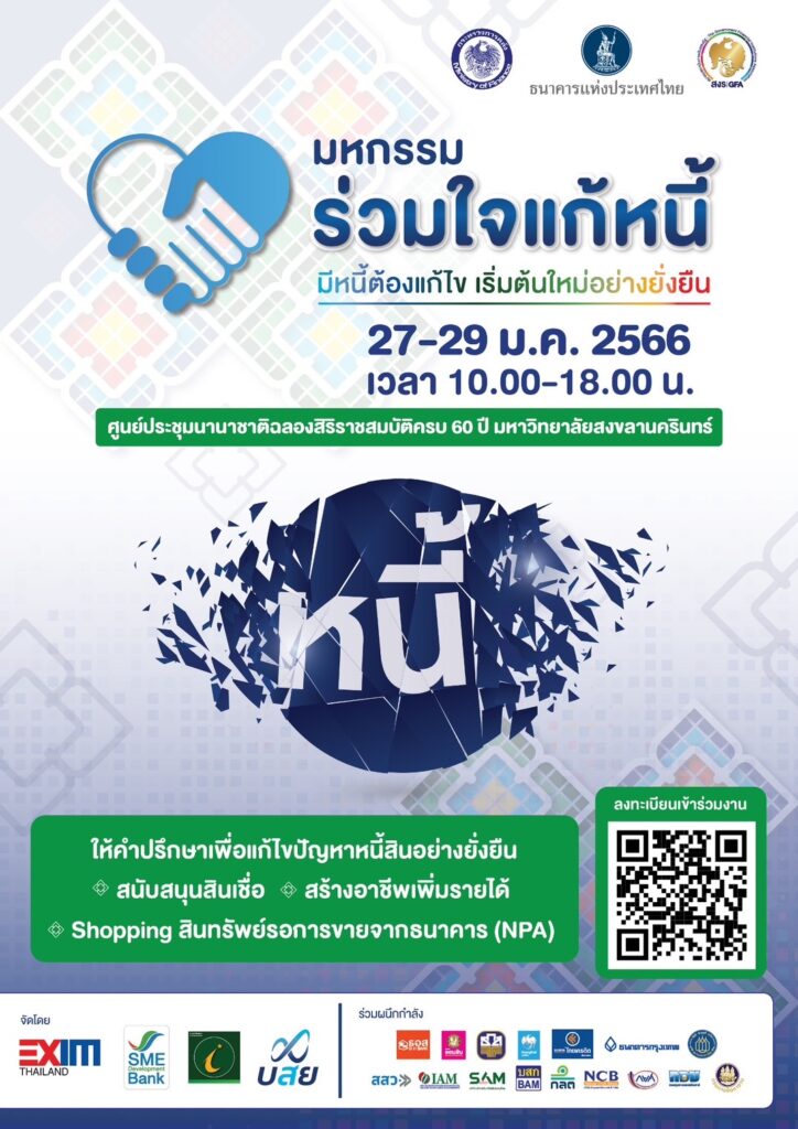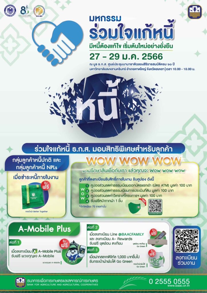 ธ.ก.ส. ขอเชิญชวนลูกหนี้ที่ประสงค์รับความช่วยเหลือและประชาชนทั่วไปที่สนใจร่วมงาน “มหกรรมร่วมใจแก้หนี้ มีหนี้ต้องแก้ไข เริ่มต้นใหม่อย่างยั่งยืน” ครั้งที่ 5 ระหว่างวันที่ 27 – 29 มกราคม 2566 ณ ศูนย์ประชุมนานาชาติฉลองสิริราชสมบัติครบ 60 ปี อำเภอหาดใหญ่ จังหวัดสงขลา หรือลงทะเบียนแจ้งความประสงค์ขอแก้ไขหนี้ออนไลน์ผ่าน https://www.bot.or.th/DebtFair/ ตั้งแต่บัดนี้จนถึง 31 มกราคม 2566.-สำนักข่าวไทย