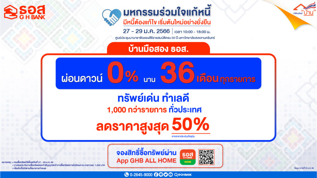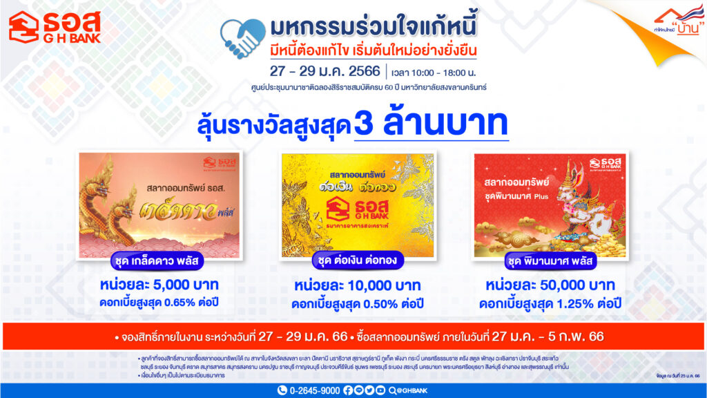 ทั้งนี้ ผู้ที่สนใจสามารถลงทะเบียนเข้าร่วมงานมหกรรมผ่านระบบของธนาคารแห่งประเทศไทยได้ที่ https://ln15.gsb.or.th/WEB-DEBT/ สอบถามรายละเอียดเพิ่มเติมได้ที่ ธอส.ทุกสาขาทั่วประเทศ G H Bank Call Center โทร 0-2645-9000 หรือ Facebook Fanpage ธนาคารอาคารสงเคราะห์ และติดตามข่าวสารของธนาคารได้ที่ Mobile Application : GHB ALL , GHB ALL GEN และ www.ghbank.co.th.-สำนักข่าวไทย