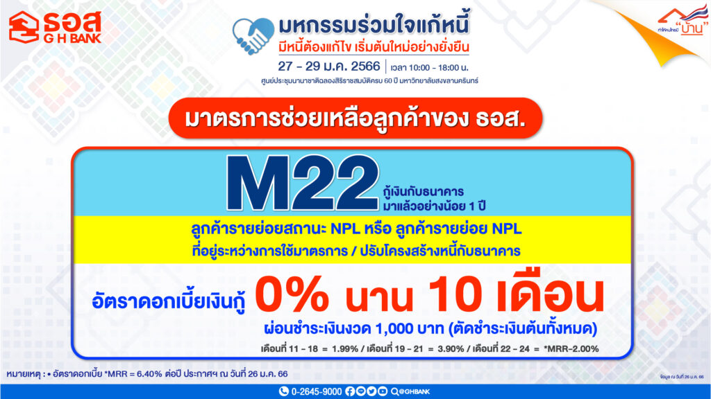 1. มาตรการแก้หนี้ ช่วยเหลือลูกค้าปัจจุบันของธนาคาร 1.มาตรการ 22 [M22] : สำหรับลูกค้ารายย่อยสถานะ NPL หรือ ลูกค้ารายย่อยสถานะ NPL อยู่ระหว่างการใช้มาตรการ/ปรับโครงสร้างหนี้ที่กู้เงินกับธนาคารมาแล้วไม่น้อยกว่า 1 ปี ให้ผ่อนเงินงวดต่ำพร้อมลดอัตราดอกเบี้ยเงินกู้พิเศษ 2 ปี เดือนที่ 1-10 ชำระเพียงงวดละ 1,000 บาท งดคิดดอกเบี้ย (ตัดชำระเงินต้นทั้งหมด), 2.มาตรการช่วยเหลือลูกค้าที่ได้รับผลกระทบทางเศรษฐกิจ : คิดเงินงวดจากอัตราดอกเบี้ยร้อยละ 3.90 ต่อปี นาน 6 เดือน และ 3.มาตรการ 17 [M17] : สำหรับลูกค้ารายย่อยสถานะ NPL หรือ ลูกค้ารายย่อยสถานะ NPL ที่อยู่ระหว่างการใช้มาตรการ/ปรับโครงสร้างหนี้ ให้ผ่อนเงินงวดต่ำพร้อมลดอัตราดอกเบี้ยเงินกู้พิเศษ 1 ปี เดือนที่ 1-3 ผ่อนชำระงวดละ 1,000 บาท ดอกเบี้ย 0% ต่อปี (ตัดชำระเงินต้นทั้งหมด)