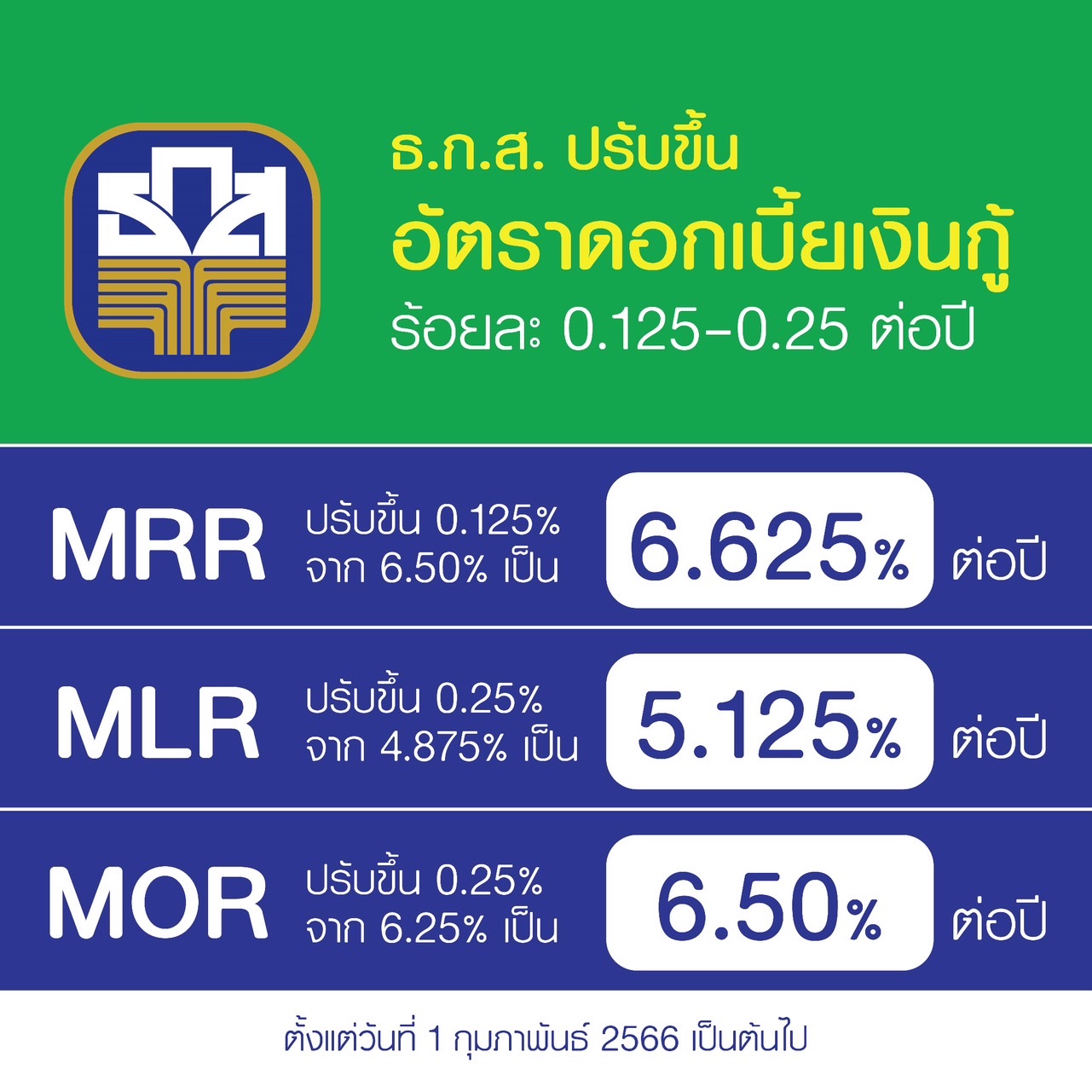 ธ.ก.ส. ได้ปรับอัตราดอกเบี้ยเงินกู้ทุกประเภทเพิ่มขึ้น เพื่อให้สอดคล้องกับทิศทางดอกเบี้ยในตลาด โดยปรับขึ้นร้อยละ 0.125 – 0.25 ต่อปี ได้แก่ อัตราดอกเบี้ยลูกค้ารายคนชั้นดี (MRR) ปรับเพิ่มขึ้นร้อยละ 0.125 ต่อปี จากปัจจุบันที่ร้อยละ 6.50 เป็นร้อยละ 6.625 ต่อปี อัตราดอกเบี้ยลูกค้าสถาบันและนิติบุคคลชั้นดี (MLR) ปรับเพิ่มขึ้นร้อยละ 0.25 ต่อปี จากปัจจุบัน ร้อยละ 4.875 เป็นร้อยละ 5.125 ต่อปี และอัตราดอกเบี้ยประเภทเงินเบิกเกินบัญชี (MOR) ปรับเพิ่มขึ้นร้อยละ 0.25 ต่อปี จากปัจจุบันที่ร้อยละ 6.25 เป็น ร้อยละ 6.50 ต่อปี โดยมีผลตั้งแต่วันที่ 1 กุมภาพันธ์ 2566 เป็นต้นไป