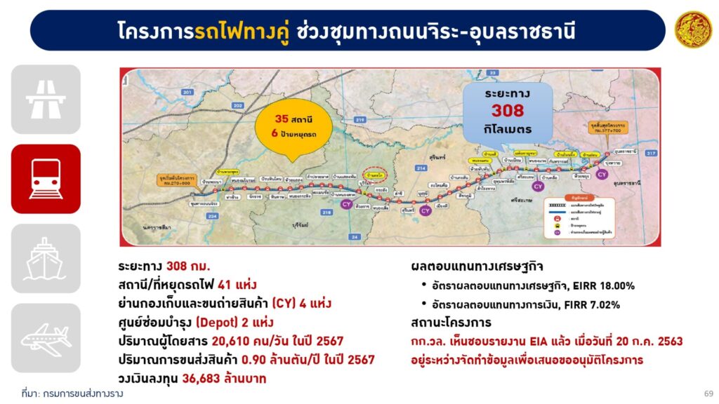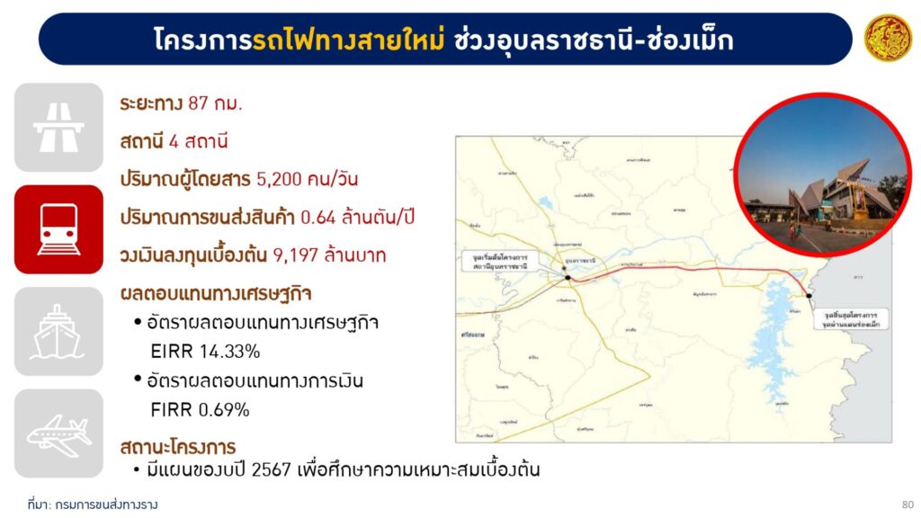 มิติทางราง มีแผนพัฒนารถไฟทางคู่ โครงการรถไฟทางคู่ช่วงชุมทางถนนจิระ-อุบลราชธานี ระยะทาง 308 กิโลเมตร ประกอบด้วยสถานีใหญ่พิเศษ จำนวน 4 สถานี สถานีขนาดใหญ่ จำนวน 3 สถานี สถานีขนาดกลาง จำนวน 8 สถานี และสถานีขนาดเล็กจำนวน 20 สถานี อยู่ระหว่างจัดทำข้อมูลเพื่อเสนอขออนุมัติโครงการ และโครงการรถไฟทางสายใหม่ ช่วงอุบลราชธานี-ช่องเม็ก มีแผนของบประมาณปี 2567 เพื่อศึกษาความเหมาะสมเบื้องต้น
