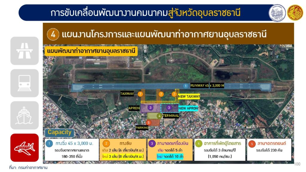 มิติทางอากาศ ปัจจุบันท่าอากาศยานอุบลราชธานีสามารถรองรับผู้โดยสารได้ 1,050 คน/ชั่วโมง ซึ่งการฟื้นตัวหลังสถานการณ์โควิด-19 มีแนวโน้มเป็นไปในทางที่ดีขึ้นในปี 2566 โดยคาดการณ์ว่าจะมีจำนวนเที่ยวบินใบปี 2566 ทั้งปี กว่า 5,254 เที่ยวบิน ผู้โดยสารรวม 1.5 ล้านคน เพื่อขยายขีดความสามารถของอาคารและผู้โดยสาร กระทรวงฯ มีแผนโครงการและแผนพัฒนาท่าอากาศยานอุบลราชธานี ได้แก่ โครงการงานก่อสร้างศูนย์ขนส่งผู้โดยสารและปรับปรุงลานจอดรถยนต์ ที่สามารถรองรับรถโดยสารประจำทาง จำนวน 2 ช่องจอด รถเช่าขับเอง จำนวน 30 ช่องจอด รถเช่าพร้อมคนขับจำนวน 5 ช่องจอด รถแท็กซี่จำนวน 28 ช่องจอด และลานจอดรถยนต์ จำนวน 164 คัน โครงการปรับปรุงระบบสายส่งไฟฟ้าลงใต้ดิน โครงการงานซ่อมบำรุงเสริมผิวทางวิ่ง ทางขับ และโครงการงานก่อสร้างทางขับและขยายลานจอดรถเครื่องบิน พร้อมระบบไฟฟ้าสนามบิน หากแล้วเสร็จจะสามารถรองรับลานจอดเครื่องบินจากเดิมจอดได้ 5 ลำ เพิ่มเป็นจอดได้ 10 ลำ ทางขับจากเดิม 2 เส้นทางขับ เพิ่มเป็น 3 เส้นทางขับ และลานจอดรถยนต์รองรับได้เพิ่ม 230 คัน