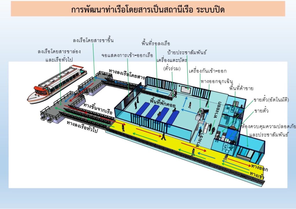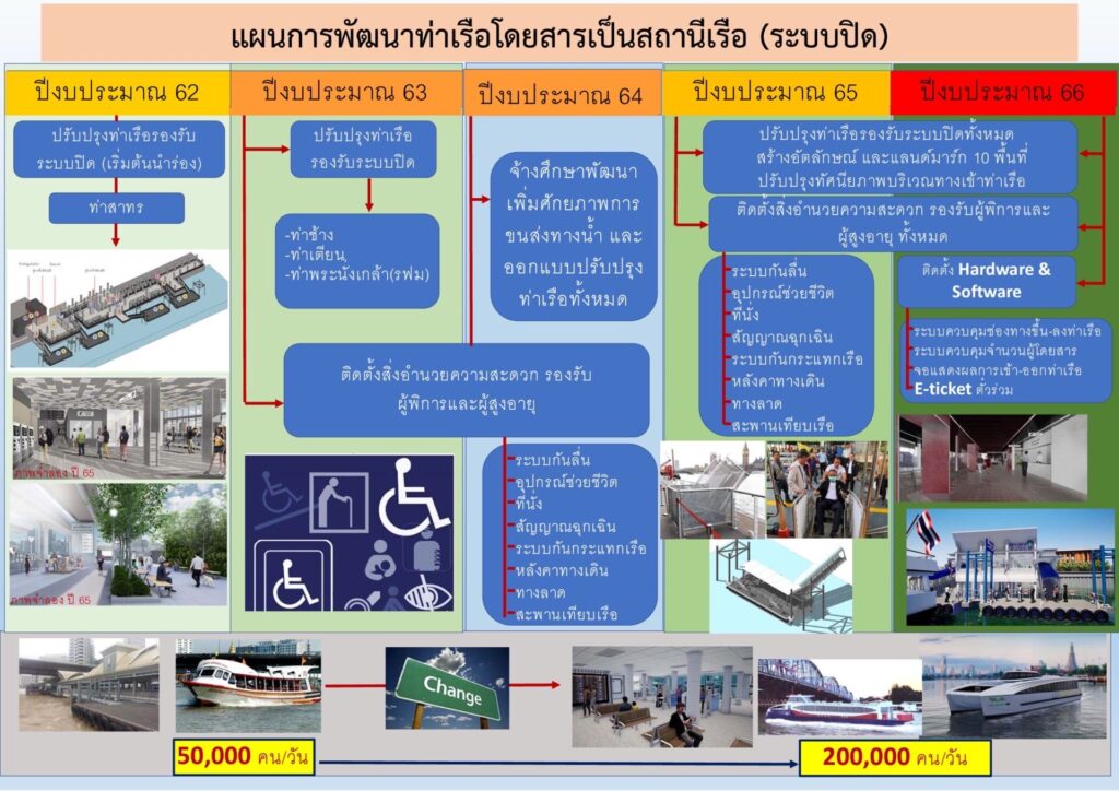 สำหรับแผนพัฒนายกระดับท่าเรือโดยสาร (Smart Pier) ในแม่น้ำเจ้าพระยา ทั้ง 29 ท่า ได้สร้างแล้วเสร็จและเปิดใช้งานแล้วจำนวน 6 แห่ง ได้แก่ ท่าเรือกรมเจ้าท่า ท่าเรือสะพานพุทธ ท่าเรือนนทบุรี ท่าเรือท่าช้าง ท่าเรือสาทร และท่าเรือพายัพในช่วงระหว่างปี 2562-2564 และในปี 2565 ที่ผ่านมา เปิดให้บริการอีก 2 แห่งได้แก่ ท่าเรือราชินีและท่าเรือบางโพ จากนั้นจะสร้างให้แล้วเสร็จในปี 2566 อีก 3 แห่งได้แก่ ท่าเรือพระราม 7 ท่าเรือท่าเตียน และท่าเรือเกียกกาย ที่เหลืออีก 18แห่ง คาดว่าแล้วเสร็จตามแผนในปี 2568 ได้แก่ ท่าเรือพระราม 5 ท่าเรือพระปิ่นเกล้าท่าเรือปากเกร็ด ท่าเรือสี่พระยา ท่าเรือเขียวไข่กา ท่าเรือสะพานกรุงธน (ซังฮี้) ท่าเรือพรานนก ท่าเรือเทเวศร์ ท่าเรือโอเรียนเต็ล ท่าเรือราชวงศ์ ท่าเรือพิบูลสงคราม 2 (นนทบุรี) ท่าเรือวัดตึก ท่าเรือพิบูลสงคราม 1 ท่าเรือวัดเขมา ท่าเรือวัดสร้อยทอง ท่าเรือวัดเทพากร ท่าเรือวัดเทพนารี และท่าเรือรถไฟ โดยเมื่อการก่อสร้างปรับปรุงท่าเรือแล้วเสร็จตามแผนทั้งหมดจะทำให้มีผู้โดยสารเพิ่มขึ้นเป็น 53,000 คนต่อวัน ในปี 2570