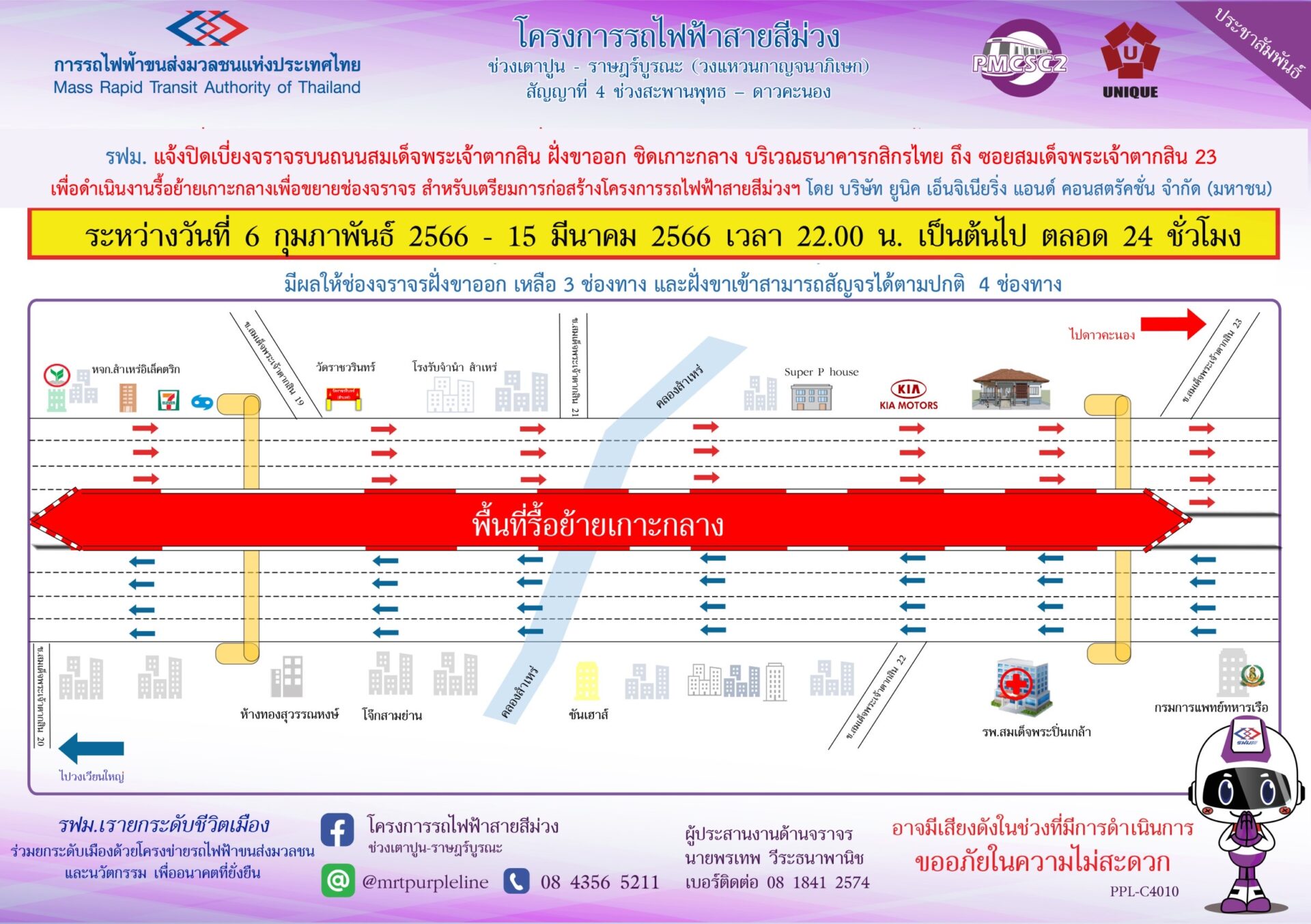 การรถไฟฟ้าขนส่งมวลชนแห่งประเทศไทย (รฟม.) แจ้งว่า บริษัท ยูนิค เอ็นจิเนียริ่ง แอนด์ คอนสตรัคชั่น จำกัด(มหาชน) ผู้รับจ้างงานออกแบบและก่อสร้างอุโมงค์ทางวิ่งและสถานีใต้ดิน โครงการรถไฟฟ้าสายสีม่วง ช่วงเตาปูน – ราษฎร์บูรณะ (วงแหวนกาญจนาภิเษก) สัญญาที่ 4 ช่วงสะพานพุทธ – ดาวคะนอง มีความจำเป็นต้องปิดเบี่ยงจราจรบนถนนสมเด็จพระเจ้าตากสิน ฝั่งขาออก ชิดเกาะกลาง บริเวณธนาคารกสิกรไทย ถึง ซอยสมเด็จพระเจ้าตากสิน 23 เพื่อดำเนินงานรื้อย้ายเกาะกลางเพื่อขยายช่องจราจร สำหรับเตรียมการก่อสร้างโครงการรถไฟฟ้าสายสีม่วงฯระหว่างวันที่ 6 กุมภาพันธ์ – 15 มีนาคม 2566 เวลา 22.00 น. เป็นต้นไป ตลอด 24 ชั่วโมง มีผลให้ช่องจราจรฝั่งขาออก เหลือ 3 ช่องทาง และฝั่งขาเข้าสามารถสัญจรได้ตามปกติ 4 ช่องทาง