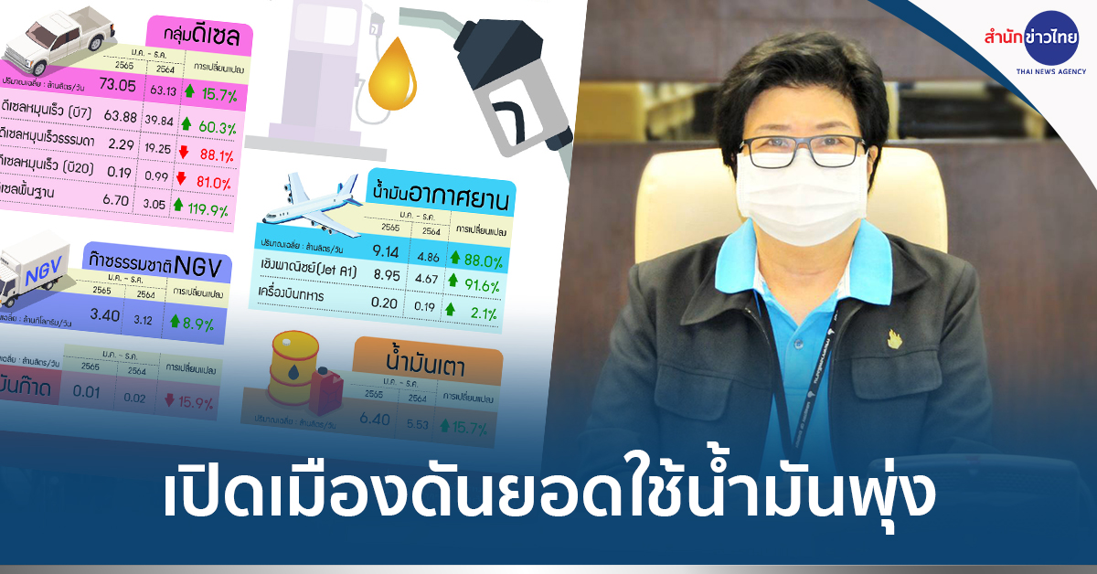 นางสาวนันธิกา ทังสุพานิช อธิบดีกรมธุรกิจพลังงาน เปิดเผยภาพรวมการใช้น้ำมันเชื้อเพลิงปี 2565 เฉลี่ยอยู่ที่ 151.16 ล้านลิตร/วัน เพิ่มขึ้นเมื่อเทียบกับช่วงเดียวกันของปีก่อนร้อยละ 13.5 ภาพรวมความต้องการใช้น้ำมันเพิ่มขึ้นอย่างต่อเนื่อง จากนักท่องเที่ยวชาวต่างขาติที่ให้ความสนใจเดินทางเข้ามาท่องเที่ยวในไทย ประกอบกับคนไทยมีการเดินทางข้ามจังหวัดมากขึ้น โดยเฉพาะในช่วงปลายปี ซึ่งเป็นช่วงเฉลิมฉลองเทศกาลปีใหม่