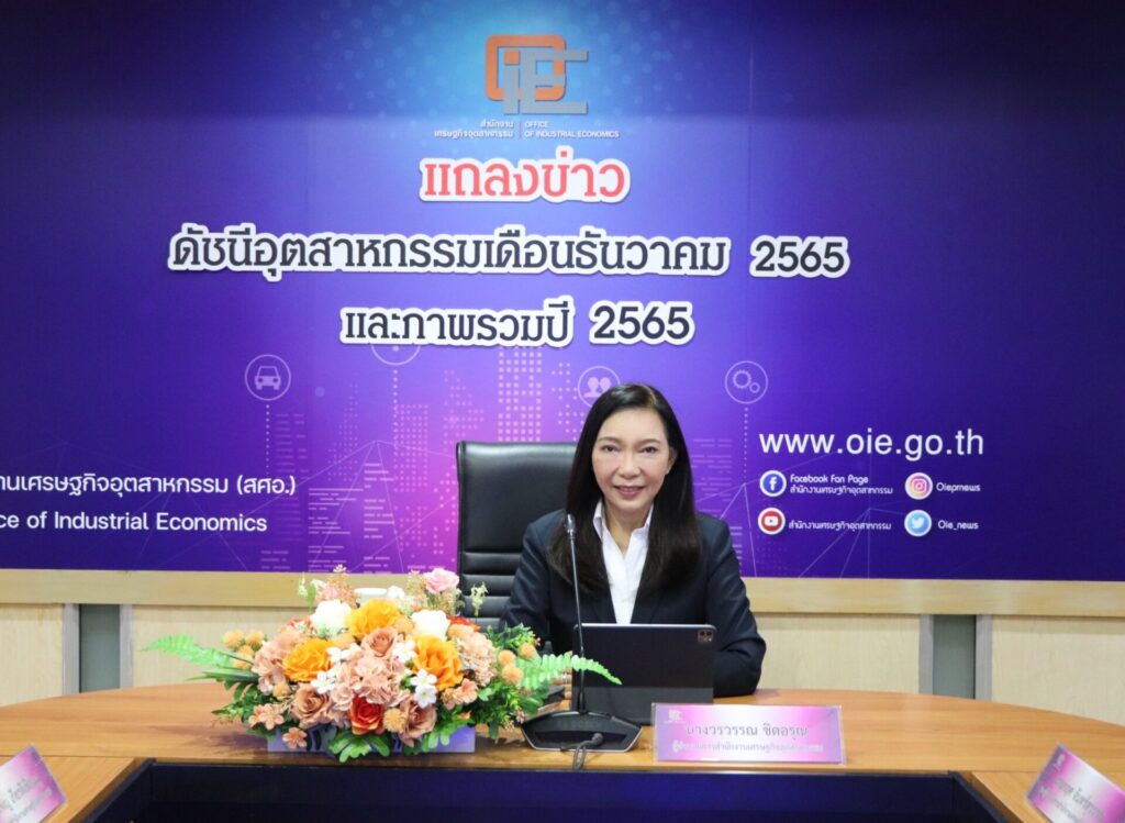 นางวรวรรณ ชิตอรุณ ผู้อำนวยการสำนักงานเศรษฐกิจอุตสาหกรรม (สศอ.) กล่าวว่า ดัชนีผลผลิตอุตสาหกรรม (MPI) เดือนธันวาคม 2565 อยู่ที่ระดับ 93.89 โดยอุตสาหกรรมหลักที่ขยายตัวในเดือนธันวาคม 2565 ได้แก่ น้ำมันปาล์มจากปริมาณผลผลิตปาล์มน้ำมันออกสู่ตลาดจำนวนมากกว่าปีก่อน ยานยนต์ จากรถยนต์นั่งขนาดกลางและรถยนต์นั่งขนาดเล็กที่ตลาดส่งออกขยายตัว และน้ำมันปิโตรเลียมที่กลับมาผลิตได้อีกครั้ง ทั้งนี้ คาดการณ์ดัชนีผลผลิตอุตสาหกรรม (MPI) เดือนมกราคม 2566 มีปัจจัยบวกจากเศรษฐกิจในประเทศที่มีแนวโน้มเติบโตต่อเนื่อง หลังได้รับแรงส่งของภาคการท่องเที่ยว รวมถึงมาตรการกระตุ้นการใช้จ่ายช้อปดีมีคืน หนุนการบริโภคในประเทศจากความต้องการซื้อสินค้าเพิ่มขึ้นต่อเนื่อง ขณะที่ปัจจัยเสี่ยงที่ควรเฝ้าระวังและติดตาม ได้แก่ ราคาพลังงานที่อยู่ในระดับสูงอุปสงค์สินค้าในตลาดโลกจากการที่ตลาดส่งออกสำคัญและคู่ค้าหลักมีแนวโน้มเข้าสู่ภาวะชะลอตัว และค่าเงินบาทที่แข็งค่าส่งผลต่อการส่งออกไทย