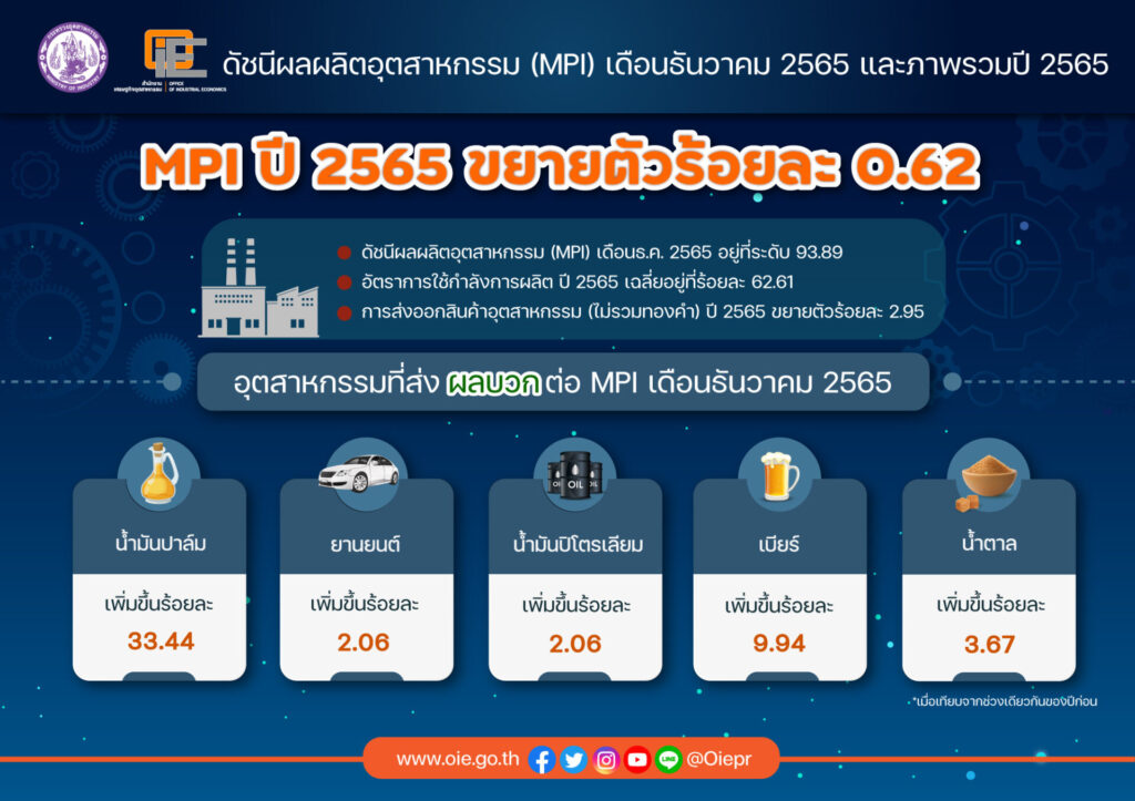 นายสุริยะ จึงรุ่งเรืองกิจ รัฐมนตรีว่าการกระทรวงอุตสาหกรรม (อก.) เปิดเผยว่า ภาพรวมดัชนีผลผลิตอุตสาหกรรม(MPI) ปี 2565 เฉลี่ยอยู่ที่ 98.32 ขยายตัวร้อยละ 0.62 เมื่อเทียบกับช่วงเดียวกันของปีก่อน โดยมีอัตราการใช้กำลังการผลิตสะสมทั้งปี เฉลี่ยอยู่ที่ร้อยละ 62.61 เป็นผลจากการขยายตัวของกิจกรรมทางเศรษฐกิจในประเทศและการท่องเที่ยวที่ฟื้นตัวดีขึ้น ขณะที่ภาพรวมการส่งออกสินค้าอุตสาหกรรม (ไม่รวมทองคำ) ปี 2565 ขยายตัวร้อยละ 2.95 เมื่อเทียบกับช่วงเดียวกันของปีก่อน ส่วนการนำเข้าสินค้าทุนปี 2565 ขยายตัวร้อยละ 2.48 เมื่อเทียบกับช่วงเดียวกันของปีก่อน และการนำเข้าสินค้าวัตถุดิบและกึ่งสำเร็จรูป (ไม่รวมทองคำ) ปี 2565 ขยายตัวร้อยละ 6.43 เมื่อเทียบกับช่วงเดียวกันของปีก่อน