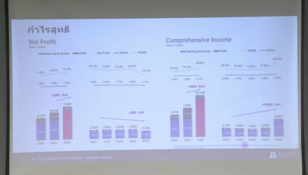 สำหรับผลประกอบการของกลุ่มธุรกิจการเงินเกียรตินาคินภัทร สำหรับปี 2565 มีกำไรสุทธิ 7,602 ล้านบาท เพิ่มขึ้นร้อยละ 20.3 จากปีก่อน โดยส่วนใหญ่มาจากธุรกิจธนาคารพาณิชย์มีผลประกอบการดีเป็นประวัติการณ์ถึงร้อยละ21.4 จากการขยายตัวในสินเชื่อทุกประเภท ด้านธุรกิจตลาดทุน ยังคงความสามารถในการสร้างรายได้ที่ดี โดยธุรกิจนายหน้าซื้อขายหลักทรัพย์ยังคงครองส่วนแบ่งอันดับหนึ่งของตลาด สำหรับธุรกิจการจัดการกองทุนก็มีรายได้เพิ่มขึ้นส่วนธุรกิจการลงทุนยังคงเติบโตได้ดีจากฝ่ายค้าหลักทรัพย์และสัญญาซื้อขายล่วงหน้า (Equity and Derivative Trading) ที่ทำกำไรได้ดีในสภาวะผันผวน ด้านวานิชธนกิจมีรายได้ในระดับที่ดีจากธุรกรรมที่เกิดขึ้นในช่วงครึ่งหลังของปี 2565 ในขณะที่ธุรกิจที่ปรึกษาการลงทุนส่วนบุคคล (Wealth Management) ปัจจุบันมีปริมาณทรัพย์สินภายใต้คำแนะนำ (Asset Under Advice, AUA) อยู่ที่กว่า 7 แสนล้านบาท.-สำนักข่าวไทย